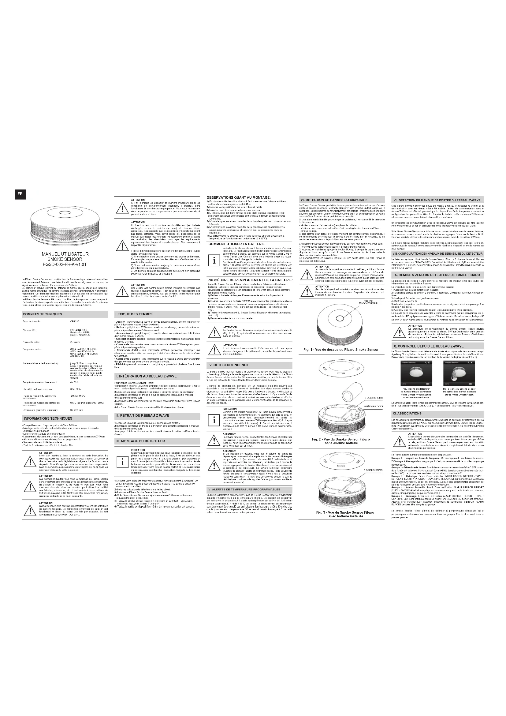 V. ALERTES DE TEMPÉRATURE PROGRAMMABLESEn plus de détecter la présence de fumée, le Smoke Sensor Fibaro est également capable d’informer d’un pic de température anormal. La fonction est désactivée par défaut via le paramètre 2. L’alerte de température est définie par l’utilisateur dans le paramètre 30 – réglé à 55°C par défaut. Le dépassement de température peut également être signalé par un indicateur lumineux (paramètre 3) et des bips courts (paramètre 4). Le paramètre 20 ne devrait jamais être réglé à 0 car cette valeur désactiverait la mesure de température.VII. DÉTECTION DU MANQUE DE PORTEE DU RESEAU Z-WAVESi le Fibaro Smoke Sensor est ajouté au réseau Z-Wave, le dispositif va vérifier si la communication avec ce réseau a bien été établie. Le test de communication avec le réseau Z-Wave est effectué pendant que le dispositif notifie la température, suivant la configuration des paramètres 20 et 21. En plus, le test de portée du réseau Z-Wave est effectué au moment du contrôle du dispositif par le réseau. Un problème de communication avec le réseau Z-Wave est signalé par une alarme sonore discontinue et par un clignotement de la indicator visuel en couleur violet.Si le Fibaro Smoke Sensor vous informe la non communication avec le réseau Z-Wave, alors nous vous recommandons de le réveiller en appuyant 3 fois sur la bouton B. Si l`alarme persiste vérifiez le fonctionnement du réseau et celui du contrôleur Z-Wave. Le Fibaro Smoke Sensor annulera cette alarme automatiquement dès qu`il entre en contact avec le réseau Z-Wave, en essayant de réveiller le dispositif en mode manuel ou automatique. Fig. 2 - Vue du Smoke Sensor Fibaro sans aucune batterie BOUTON B ET INDICATEUR VISUEL1) Ajoutez votre dispositif dans votre réseau Z-Wave (voir point I). Attention! On peut l`ajouter au réseau Z-Wave uniquement quand il se trouve à proximité immédiate du contrôleur.2) Installez la fixation du détecteur dans le lieu choisi.3) Installez le Fibaro Smoke Sensor dans sa fixation.4) Si le Fibaro Smoke Sensor est ajouté au réseau Z-Wave réveillez-le en appuyant trois fois le bouton B.5) Testez le Smoke Sensor Fibaro en effectuant un auto test - appuyez et maintenez appuyé le bouton B (voir p.VI)6) Testez la portée du dispositif en vérifiant si la communication est correcte.ATTENTIONDes études ont montré qu’une alarme incendie ne réveillait pas tous les occupants endormis, il est donc de la responsabilité des autres résidents, réveillés, eux, par l’alarme, de les réveiller pour les aider à quitter la zone en toute sécurité. ATTENTIONAvant son montage, lisez le contenu de cette instruction. Le non-respect de ces recommandations peut s`avérer dangereux et aller à l`encontre de la législation en vigueur. Le fabricant de ce dispositif, Fibar Group Sp. z o.o. ne sera pas tenu responsable pour les dommages causés par toute utilisation qui ne suit pas les recommandations de cette instruction. ATTENTIONLes travaux en hauteur liés avec le montage du Fibaro Smoke Sensor doivent être effectués avec des précautions particulières, en utilisant le matériel et les outils en bon état. Nous vous recommandons de prêter une attention particulière à la stabilité des échelles, élévateurs, etc. Il faut maintenir les conditions de tout travail avec des outils électriques sûrs suivant les recomman-dations et instructions de leurs fabricants. ATTENTIONLa maintenance et le contrôle du détecteur doivent être effectués de manière régulière. Le fabricant recommande de faire un test fonctionnel et visuel au moins une fois par semaine. Le test fonctionnel inclue l’auto test (voir p.VI).