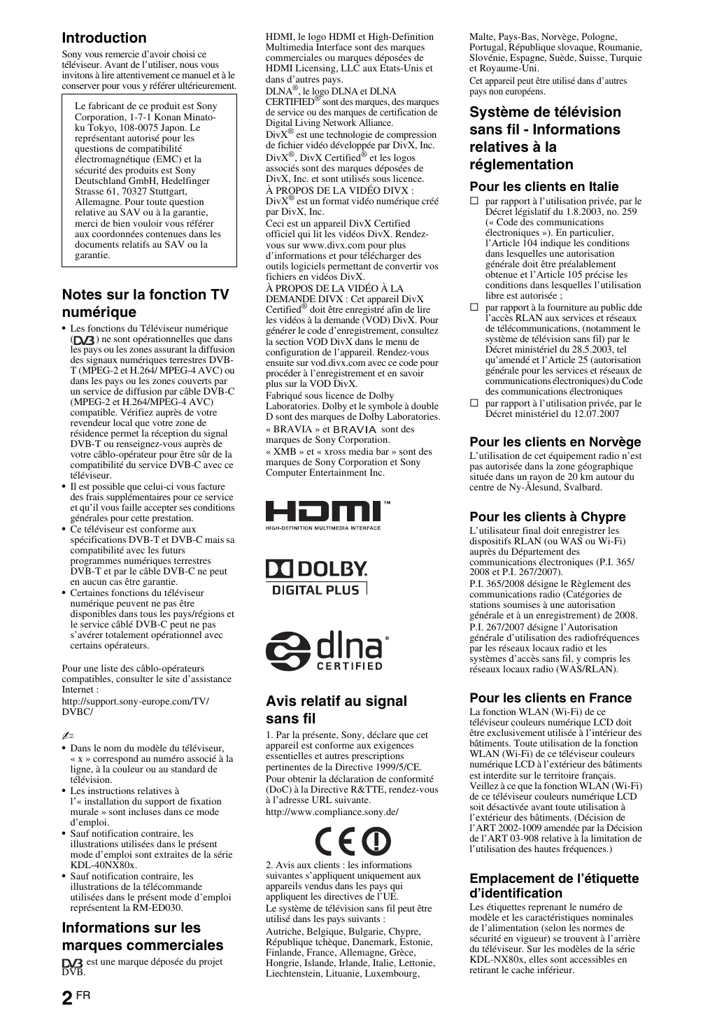 DEMANDE DIVX : Cet appareil DivX Certified® doit être enregistré afin de lire les vidéos à la demande (VOD) DivX. Pour générer le code d’enregistrement, consultez la section VOD DivX dans le menu de configuration de l’appareil. Rendez-vous ensuite sur vod.divx.com avec ce code pour procéder à l’enregistrement et en savoir plus sur la VOD DivX. Fabriqué sous licence de Dolby Laboratories. Dolby et le symbole à double D sont des marques de Dolby Laboratories. « BRAVIA » et sont des marques de Sony Corporation. « XMB » et « xross media bar » sont des marques de Sony Corporation et Sony Computer Entertainment Inc. Malte, Pays-Bas, Norvège, Pologne, Portugal, République slovaque, Roumanie, Slovénie, Espagne, Suède, Suisse, Turquie et Royaume-Uni. Cet appareil peut être utilisé dans d’autres pays non européens. Système de télévision sans fil - Informations relatives à la réglementation Pour les clients en Italie s par rapport à l’utilisation privée, par le Décret législatif du 1.8.2003, no. 259 (« Code des communications électroniques »). En particulier, l’Article 104 indique les conditions dans lesquelles une autorisation générale doit être préalablement obtenue et l’Article 105 précise les conditions dans lesquelles l’utilisation libre est autorisée ; s par rapport à la fourniture au public dde l’accès RLAN aux services et réseaux de télécommunications, (notamment le système de télévision sans fil) par le Décret ministériel du 28.5.2003, tel qu’amendé et l’Article 25 (autorisation générale pour les services et réseaux de communications électroniques) du Code des communications électroniques s par rapport à l’utilisation privée, par le Décret ministériel du 12.07.2007 Pour les clients en Norvège L’utilisation de cet équipement radio n’est pas autorisée dans la zone géographique située dans un rayon de 20 km autour du centre de Ny-Ålesund, Svalbard. Pour les clients à Chypre L’utilisateur final doit enregistrer les dispositifs RLAN (ou WAS ou Wi-Fi) auprès du Département des communications électroniques (P.I. 365/ 2008 et P.I. 267/2007). P.I. 365/2008 désigne le Règlement des communications radio (Catégories de stations soumises à une autorisation générale et à un enregistrement) de 2008. P.I. 267/2007 désigne l’Autorisation générale d’utilisation des radiofréquences par les réseaux locaux radio et les systèmes d’accès sans fil, y compris les réseaux locaux radio (WAS/RLAN). Avis relatif au signal sans fil