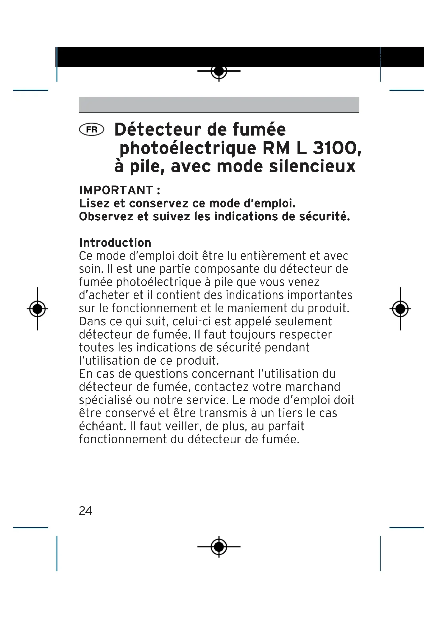 0786-CPR-21504 EN 14604:2005 VDS3131:2010-05 DOP-BRT-0011 Smoke detector Fire protection 086215 Rauchwarnmelder RM L 3100.qxp_086215 BA_Rauchwar24 Détecteur de fumée photoélectrique RM L 3100, à pile, avec mode silencieux IMPORTANT : Lisez et conservez ce mode d’emploi. Observez et suivez les indications de sécurité. Introduction Ce mode d’emploi doit être lu entièrement et avec soin. Il est une partie composante du détecteur de fumée photoélectrique à pile que vous venez d’acheter et il contient des indications importantes sur le fonctionnement et le maniement du produit. Dans ce qui suit, celui-ci est appelé seulement détecteur de fumée. Il faut toujours respecter toutes les indications de sécurité pendant l’utilisation de ce produit. En cas de questions concernant l’utilisation du détecteur de fumée, contactez votre marchand spécialisé ou notre service. Le mode d’emploi doit être conservé et être transmis à un tiers le cas échéant. Il faut veiller, de plus, au parfait fonctionnement du détecteur de fumée. 086215 Rauchwarnmelder RM L 3100.qxp_086215 BA_RauchwarCaractéristiques techniques : Appareil : RM L 3100 Reconnaissance VDS : DIN EN 14604/VDS + label Q/G216044 Domaine d’application : selon DIN 14676 Alarme acoustique : 85dB (3 m de distance) Alimentation électrique : pile lithium 3V DC incorporée définitivement Durée de vie de la pile : 10 ans Température ambiante : 0 °C à 39 °C Type de protection : IP 20 Choix du lieu de montage Les lieux de montage des détecteurs de fumée sont réglés fermement dans la norme d’applica- tion DIN EN 14676 en vigueur pour Allemagne.