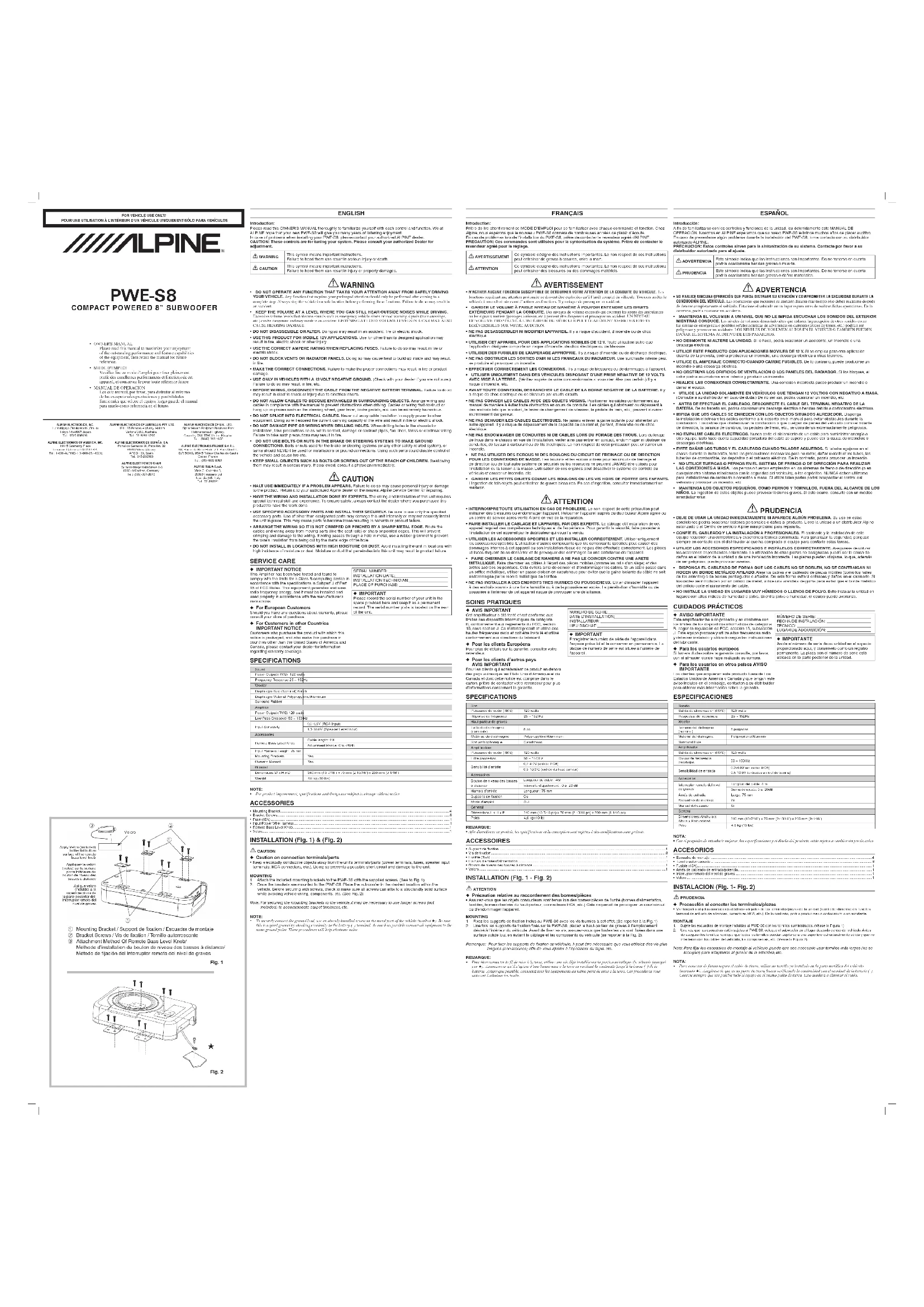 Tosecurelyconnectthegroundlead,useanalreadyinstalledscrewonthemetalpartofthevehicle(marked★).Besure thisisagoodgroundbycheckingcontinuitytothebattery(–)terminal.Asmuchaspossibleconnectallequipmenttothe samegroundpoint.Theseprocedureswillhelpeliminatenoise. FRANÇAIS Introduction:Prière de lire attentivement ce MODE D’EMPLOI pour se familiariser avec chaque commande et fonction. Chez Alpine, nous espérons que le nouveau PWE-S8 donnera de nombreuses années de plaisir d’écoute. En cas de problèmes lors de l’installation du PWE-S8, prière de contacter le revendeur agréé d’ALPINE. PRECAUTION: Ces commandes sont utilisées pour la syntonisation du système. Prière de contacter le revendeur agréé pour le réglage. AVERTISSEMENTCe symbole désigne des instructions importantes. Le non-respect de ces instructions peut entraîner de graves blessures, voire la mort. ATTENTIONCe symbole désigne des instructions importantes. Le non-respect de ces instructions peut entraîner des blessures ou des dommages matériels. AVERTISSEMENT