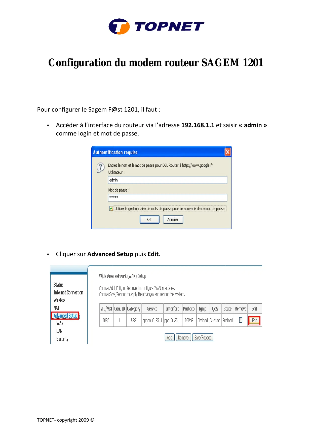 €) TOPNET Configuration du modem routeur SAGEM 1201 Pour configurer le Sagem F@st 1201, il faut : *__ Accéder à l'interface du routeur via l'adresse 192.168.1.1 et saisir « admin » comme login et mot de passe. Authentification requise.