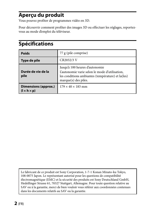 Aperçu du produit Vous pouvez profiter de programmes vidéo en 3D. Pour découvrir comment profiter des images 3D ou effectuer les réglages, reportezvous au mode d’emploi du téléviseur. Spécifications Poids Durée de vie de la pile Jusqu’à 100 heures d’autonomie L’autonomie varie selon le mode d’utilisation, les conditions ambiantes (température) et la(les) marque(s) des piles. Le fabricant de ce produit est Sony Corporation, 1-7-1 Konan Minato-ku Tokyo, 108-0075 Japon. Le représentant autorisé pour les questions de compatibilité électromagnétique (EMC) et la sécurité des produits est Sony Deutschland GmbH, Hedelfinger Strasse 61, 70327 Stuttgart, Allemagne. Pour toute question relative au SAV ou à la garantie, merci de bien vouloir vous référer aux coordonnées contenues dans les documents relatifs au SAV ou la garantie. (FR) Elimination des piles et accumulateurs usagés (Applicable dans les pays de l’Union Européenne et aux autres pays européens disposant de systèmes de collecte sélective) Ce symbole, apposé sur les piles et accumulateurs ou sur les emballages, indique que les piles et accumulateurs fournis avec ce produit ne doivent pas être traités comme de simples déchets ménagers. Sur certains types de piles, ce symbole apparaît parfois combiné avec un symbole chimique. Les symboles pour le mercure (Hg) ou le plomb (Pb) sont rajoutés lorsque ces piles contiennent plus de 0,0005% de mercure ou 0,004% de plomb. En vous assurant que ces piles et accumulateurs sont mis au rebut de façon appropriée, vous participez activement à la prévention des conséquences négatives que leur mauvais traitement pourrait provoquer sur l’environnement et sur la santé humaine. Le recyclage des matériaux contribue par ailleurs à la préservation des ressources naturelles. Pour les produits qui pour des raisons de sécurité, de performance ou d’intégrité de données nécessitent une connexion permanente à une pile ou à un accumulateur, il conviendra de vous rapprocher d’un service technique qualifié pour effectuer son remplacement. En rapportant votre appareil électrique en fin de vie à un point de collecte approprié vous vous assurez que la pile ou l’accumulateur incorporée sera traitée correctement. Pour tous les autres cas de figure et afin d’enlever les piles ou accumulateurs en toute sécurité de votre appareil, reportez-vous au manuel d’utilisation. Rapportez les piles ou accumulateurs usagés au point de collecte approprié pour le recyclage. Pour toute information complémentaire au sujet du recyclage de ce produit ou des piles et accumulateurs, vous pouvez contacter votre municipalité, votre déchetterie locale ou le point de vente où vous avez acheté ce produit. Elimination des lunettes 3D Traitement des appareils électriques et électroniques en fin de vie (Applicable dans les pays de l’Union Européenne et aux autres pays européens disposant de systèmes de collecte sélective) Ce symbole, apposé sur le produit ou sur son emballage, indique que ce produit ne doit pas être traité avec les déchets ménagers. Il doit être remis à un point de collecte approprié pour le recyclage des équipements électriques et électroniques. En s’assurant que ce produit est bien mis au rebut de manière appropriée, vous aiderez à prévenir les conséquences négatives potentielles pour l’environnement et la santé humaine. Le recyclage des matériaux aidera à préserver les ressources naturelles. Pour des informations détaillées sur le recyclage de ce produit, veuillez contacter le service municipal local, le service chargé du traitement des déchets ménagers ou le magasin où vous avez acheté le produit. (FR)