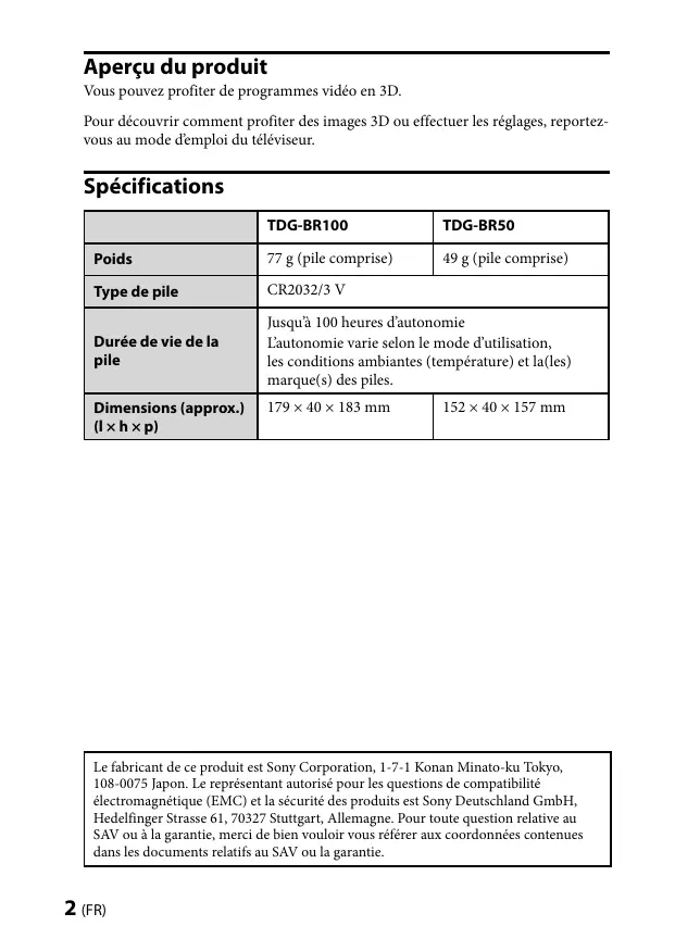 Aperçu du produit Vous pouvez profiter de programmes vidéo en 3D. Pour découvrir comment profiter des images 3D ou effectuer les réglages, reportezvous au mode d’emploi du téléviseur. Spécifications TDG-BR100 TDG-BR50 Poids Durée de vie de la pile Jusqu’à 100 heures d’autonomie L’autonomie varie selon le mode d’utilisation, les conditions ambiantes (température) et la(les) marque(s) des piles. Le fabricant de ce produit est Sony Corporation, 1-7-1 Konan Minato-ku Tokyo, 108-0075 Japon. Le représentant autorisé pour les questions de compatibilité électromagnétique (EMC) et la sécurité des produits est Sony Deutschland GmbH, Hedelfinger Strasse 61, 70327 Stuttgart, Allemagne. Pour toute question relative au SAV ou à la garantie, merci de bien vouloir vous référer aux coordonnées contenues dans les documents relatifs au SAV ou la garantie. (FR) Elimination des piles et accumulateurs usagés (Applicable dans les pays de l’Union Européenne et aux autres pays européens disposant de systèmes de collecte sélective) Ce symbole, apposé sur les piles et accumulateurs ou sur les emballages, indique que les piles et accumulateurs fournis avec ce produit ne doivent pas être traités comme de simples déchets ménagers. Sur certains types de piles, ce symbole apparaît parfois combiné avec un symbole chimique. Les symboles pour le mercure (Hg) ou le plomb (Pb) sont rajoutés lorsque ces piles contiennent plus de 0,0005% de mercure ou 0,004% de plomb. En vous assurant que ces piles et accumulateurs sont mis au rebut de façon appropriée, vous participez activement à la prévention des conséquences négatives que leur mauvais traitement pourrait provoquer sur l’environnement et sur la santé humaine. Le recyclage des matériaux contribue par ailleurs à la préservation des ressources naturelles. Pour les produits qui pour des raisons de sécurité, de performance ou d’intégrité de données nécessitent une connexion permanente à une pile ou à un accumulateur, il conviendra de vous rapprocher d’un service technique qualifié pour effectuer son remplacement. En rapportant votre appareil électrique en fin de vie à un point de collecte approprié vous vous assurez que la pile ou l’accumulateur incorporée sera traitée correctement. Pour tous les autres cas de figure et afin d’enlever les piles ou accumulateurs en toute sécurité de votre appareil, reportez-vous au manuel d’utilisation. Rapportez les piles ou accumulateurs usagés au point de collecte approprié pour le recyclage. Pour toute information complémentaire au sujet du recyclage de ce produit ou des piles et accumulateurs, vous pouvez contacter votre municipalité, votre déchetterie locale ou le point de vente où vous avez acheté ce produit. Elimination des lunettes 3D Traitement des appareils électriques et électroniques en fin de vie (Applicable dans les pays de l’Union Européenne et aux autres pays européens disposant de systèmes de collecte sélective) Ce symbole, apposé sur le produit ou sur son emballage, indique que ce produit ne doit pas être traité avec les déchets ménagers. Il doit être remis à un point de collecte approprié pour le recyclage des équipements électriques et électroniques. En s’assurant que ce produit est bien mis au rebut de manière appropriée, vous aiderez à prévenir les conséquences négatives potentielles pour l’environnement et la santé humaine. Le recyclage des matériaux aidera à préserver les ressources naturelles. Pour des informations détaillées sur le recyclage de ce produit, veuillez contacter le service municipal local, le service chargé du traitement des déchets ménagers ou le magasin où vous avez acheté le produit. Avertissement Commencez par lire ces consignes de sécurité afin de préserver votre sécurité personnelle et d’éviter les dégâts aux biens. (Suite) (FR)
