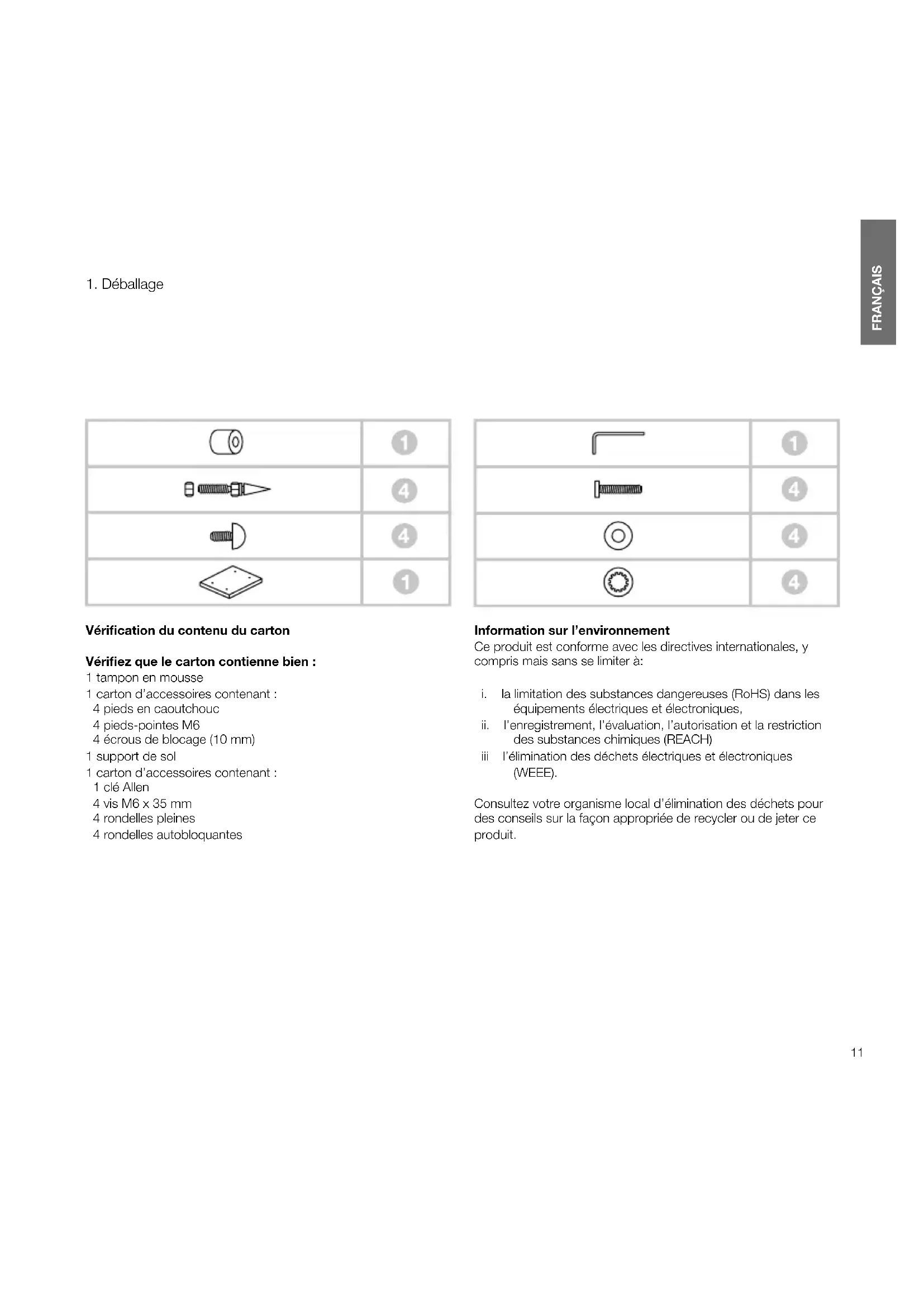 Vérication du contenu du carton Vériez que le carton contienne bien : 1 tampon en mousse 1 carton d’accessoires contenant : 4 pieds en caoutchouc 4 pieds-pointes M6 4 écrous de blocage (10 mm) 1 support de sol 1 carton d’accessoires contenant : 1 clé Allen 4 vis M6 x 35 mm 4 rondelles pleines 4 rondelles autobloquantes Information sur l’environnement Ce produit est conforme avec les directives internationales, y compris mais sans se limiter à: