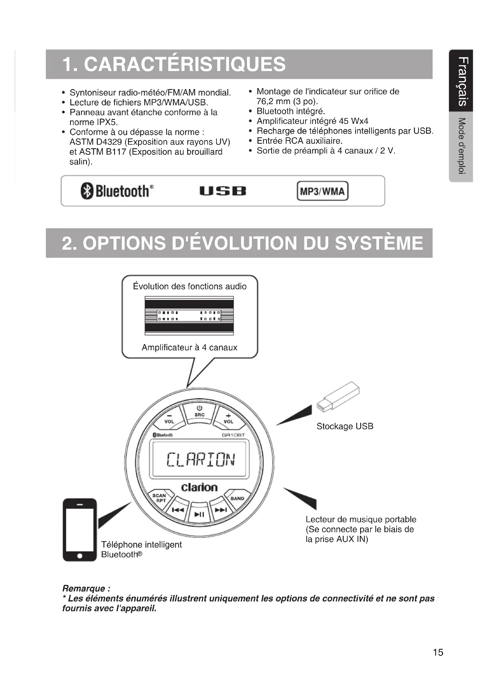 - Les éléments énumérés illustrent uniquement les options de connectivité et ne sont pas fournis avec l'appareil. Évolution des fonctions audio Amplicateur à 4 canaux Stockage USB Lecteur de musique portable (Se connecte par le biais de la prise AUX IN) Téléphone intelligent Bluetooth ®Français Mode d'emploi