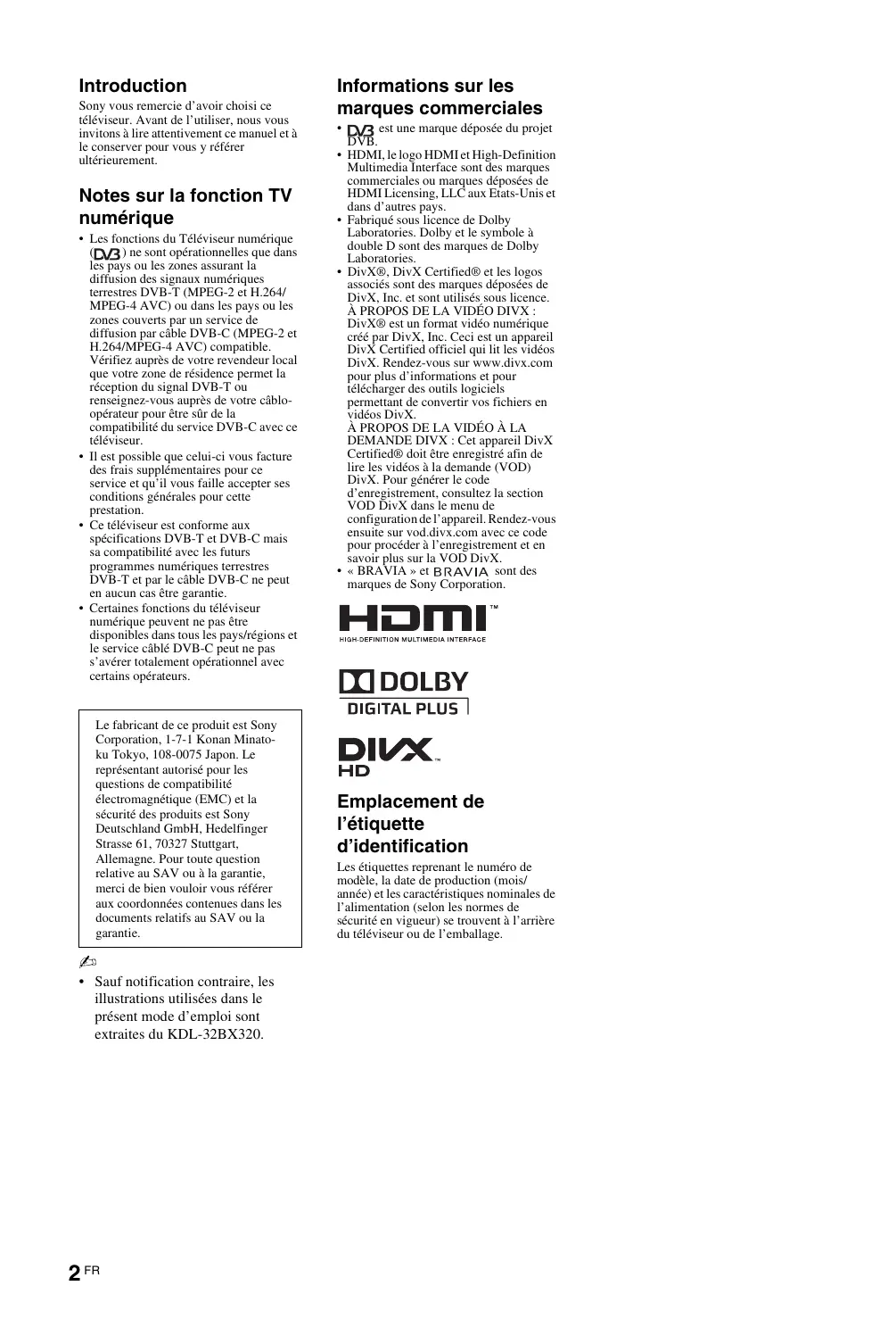 - Certaines fonctions du téléviseur numérique peuvent ne pas être disponibles dans tous les pays/régions et le service câblé DVB-C peut ne pas s’avérer totalement opérationnel avec certains opérateurs. Le fabricant de ce produit est Sony Corporation, 1-7-1 Konan Minatoku Tokyo, 108-0075 Japon. Le représentant autorisé pour les questions de compatibilité électromagnétique (EMC) et la sécurité des produits est Sony Deutschland GmbH, Hedelfinger Strasse 61, 70327 Stuttgart, Allemagne. Pour toute question relative au SAV ou à la garantie, merci de bien vouloir vous référer aux coordonnées contenues dans les documents relatifs au SAV ou la garantie.