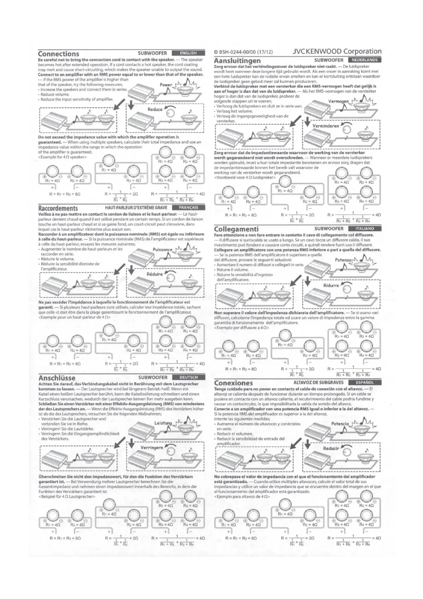 pas exceder !'impedance a laquelle le fonctionnement de l'amplificateur est garanti. - plusieurs haut-parleurs sont utilises, calculer leur impedance totale, sachant que celle- doit etre dans la plage garantissant le fonctionnement l'amplificateur <Exemple pour
