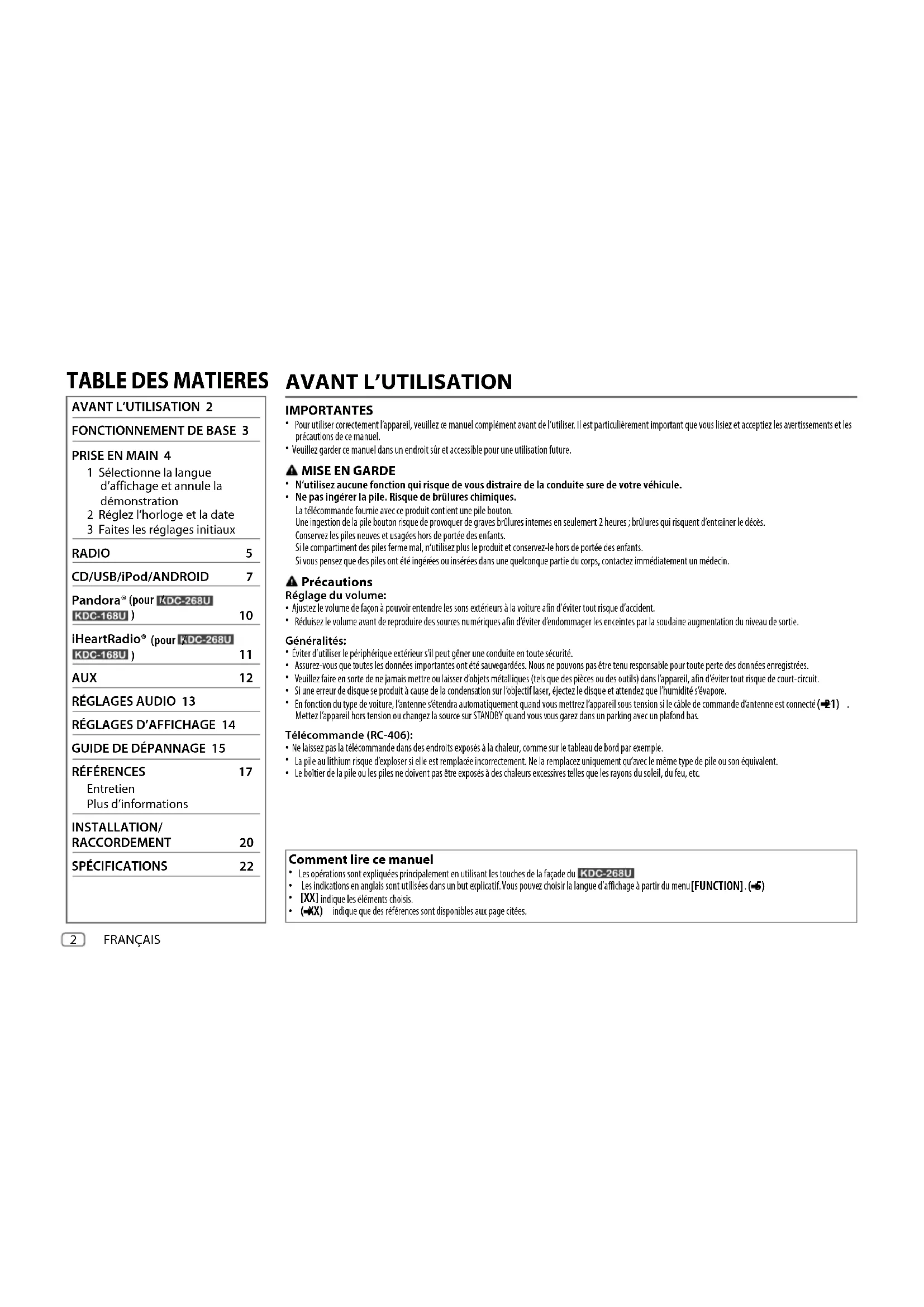 Le boîtier de la pile ou les piles ne doivent pas être exposés à des chaleurs excessives telles que les rayons du soleil, du feu, etc. Comment lire ce manuel