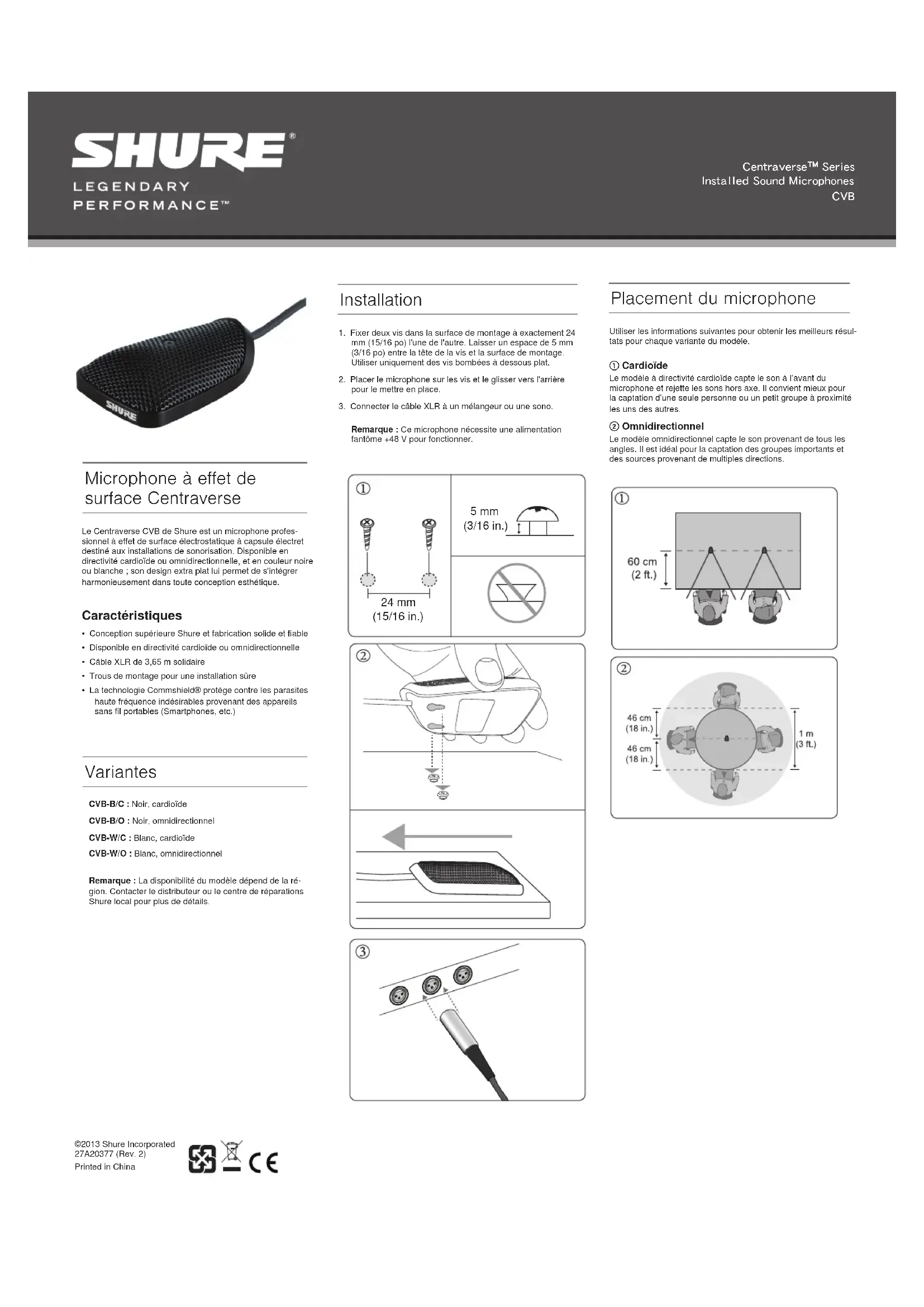 ©2013 Shure Incorporated 27A20377 (Rev. 2) Printed in China Variantes CVB-B/C : Noir, cardioïde CVB-B/O : Noir, omnidirectionnel CVB-W/C : Blanc, cardioïde CVB-W/O : Blanc, omnidirectionnel Microphone à effet de surface Centraverse Le Centraverse CVB de Shure est un microphone profes- sionnel à effet de surface électrostatique à capsule électret destiné aux installations de sonorisation. Disponible en directivité cardioïde ou omnidirectionnelle, et en couleur noire ou blanche ; son design extra plat lui permet de s'intégrer harmonieusement dans toute conception esthétique. Caractéristiques