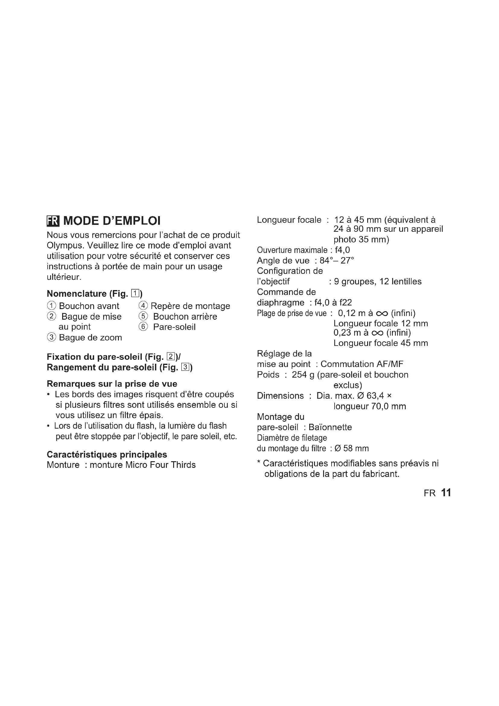 - Lors de l’utilisation du flash, la lumière du flash peut être stoppée par l’objectif, le pare soleil, etc. Caractéristiques principales Monture : monture Micro Four Thirds Longueur focale : 12 à 45 mm (équivalent à 24 à 90 mm sur un appareil photo 35 mm) Ouverture maximale : f4,0 Angle de vue : 84°– 27° Configuration de l’objectif : 9 groupes, 12 lentilles Commande de diaphragme : f4,0 à f22 Plage de prise de vue : 0,12 m à ) (infini) Longueur focale 12 mm 0,23 m à ) (infini) Longueur focale 45 mm Réglage de la mise au point : Commutation AF/MF Poids : 254 g (pare-soleil et bouchon exclus) Dimensions : Dia. max. Ø 63,4 × longueur 70,0 mm Montage du pare-soleil : Baïonnette Diamètre de filetage du montage du filtre : Ø 58 mm