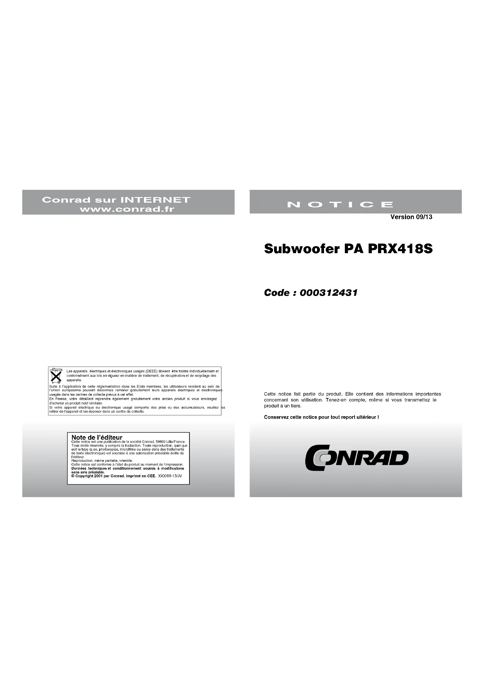 Note de l’éditeur Cette notice est une publication de la société Conrad, 59800 Lille/France.Tous droits réservés, y compris la traduction. Toute reproduction, quel que soit le type (p.ex. photocopies, microfilms ou saisie dans des traitements de texte électronique) est soumise à une autorisation préalable écrite de l’éditeur.Reproduction, même partielle, interdite.Cette notice est conforme à l’état du produit au moment de l’impression.Données techniques et conditionnement soumis à modifications sans avis préalable.© Copyright 2001 par Conrad. Imprimé en CEE. XXX/09-13/JV Subwoofer PA PRX418S Code : 000312431 Cette notice fait partie du produit. Elle contient des informations importantes concernant son utilisation. Tenez-en compte, même si vous transmettez le produit à un tiers. Conservez cette notice pour tout report ultérieur ! N O T I C E Conrad sur INTERNET www.conrad.fr Version 09/13 Les appareils électriques et électroniques usagés (DEEE) doivent être traités individuellement et conformément aux lois en vigueur en matière de traitement, de récupération et de recyclage des appareils. Suite à l’application de cette réglementation dans les Etats membres, les utilisateurs résidant au sein de l’Union européenne peuvent désormais ramener gratuitement leurs appareils électriques et électroniques usagés dans les centres de collecte prévus à cet effet.En France, votre détaillant reprendra également gratuitement votre ancien produit si vous envisagez d’acheter un produit neuf similaire.Si votre appareil électrique ou électronique usagé comporte des piles ou des accumulateurs, veuillez les retirer de l’appareil et les déposer dans un centre de collecte.2 7 CARACTERISTIQUES ELECTRIQUES ET ACOUSTIQUES : Impédance nominale : 8 Ohms Puissance nominale du système, bruit rose : 800W/ 1600W/ 3200W, 2 heures (Continu/ programme/pic) Réponse en fréquence : (±3 dB) : 52 Hz - 120 Hz Bande de fréquences : (-10 dB) : 35 Hz - 250 kHz SPL maximum : 124 dB pic SPL (130 dB pic SPL) Sensibilité : 95 dB SPL, 100 dB SPL, 1 Watt @ 1 mètre Fréquence de coupure : 80 Hz 24 - 48 dB/octave 35 Hz 24 dB / octave passe-haut subsonique ELEMENTS DU SYSTEME : Cabinet : Enceinte (non disponible à la vente) Grille : 444737-002 Transducteur basse fréquence : Woofer au sélénium 18SWS1000 457 mm Résistance DC : 5,8 Ohms Coupelle d’entrée : 5011409 SPECIFICATIONS DU TEST A BALAYAGE AUDIO : A. Test à balayage audio du système : 7 V à l’entrée, 30 Hz à 300 Hz B. Test à balayage audio basses fréquences : 7 V à l’entrée, 30 Hz à 300 Hz (?) SPECIFICATIONS PHYSIQUES : Dimensions de l’enceinte : 678 x 536 x 615 mm Poids à l’expédition : 36 kg GARANTIE : Voir la déclaration de garantie fournie avec chaque appareil.