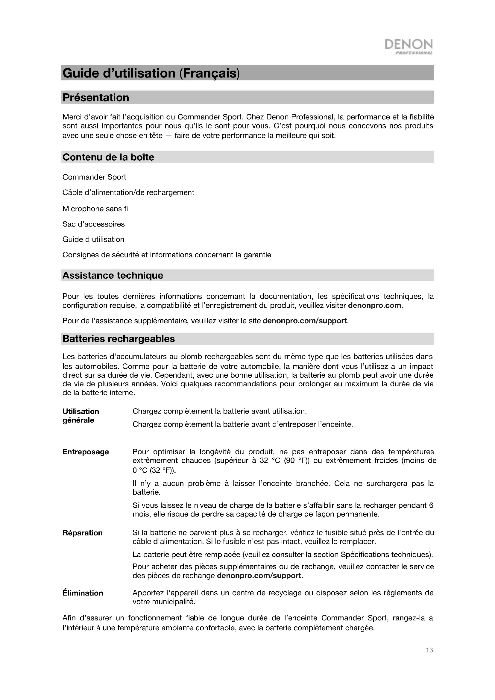 Contenu de la boîte Commander Sport Câble d’alimentation/de rechargement Microphone sans fil Sac d'accessoires Guide d'utilisation Consignes de sécurité et informations concernant la garantie Assistance technique Pour les toutes dernières informations concernant la documentation, les spécifications techniques, la configuration requise, la compatibilité et l’enregistrement du produit, veuillez visiter denonpro.com. Pour de l’assistance supplémentaire, veuillez visiter le site denonpro.com/support. Batteries rechargeables Les batteries d'accumulateurs au plomb rechargeables sont du même type que les batteries utilisées dans les automobiles. Comme pour la batterie de votre automobile, la manière dont vous l’utilisez a un impact direct sur sa durée de vie. Cependant, avec une bonne utilisation, la batterie au plomb peut avoir une durée de vie de plusieurs années. Voici quelques recommandations pour prolonger au maximum la durée de vie de la batterie interne. Utilisation générale Chargez complètement la batterie avant utilisation. Chargez complètement la batterie avant d’entreposer l’enceinte. Entreposage Pour optimiser la longévité du produit, ne pas entreposer dans des températures extrêmement chaudes (supérieur à 32 °C (90 °F)) ou extrêmement froides (moins de 0 °C (32 °F)). Il n’y a aucun problème à laisser l’enceinte branchée. Cela ne surchargera pas la batterie. Si vous laissez le niveau de charge de la batterie s’affaiblir sans la recharger pendant 6 mois, elle risque de perdre sa capacité de charge de façon permanente. Réparation Si la batterie ne parvient plus à se recharger, vérifiez le fusible situé près de l'entrée du câble d'alimentation. Si le fusible n'est pas intact, veuillez le remplacer. La batterie peut être remplacée (veuillez consulter la section Spécifications techniques). Pour acheter des pièces supplémentaires ou de rechange, veuillez contacter le service des pièces de rechange denonpro.com/support. Élimination Apportez l’appareil dans un centre de recyclage ou disposez selon les règlements de votre municipalité. Afin d’assurer un fonctionnement fiable de longue durée de l’enceinte Commander Sport, rangez-la à l’intérieur à une température ambiante confortable, avec la batterie complètement chargée.14
