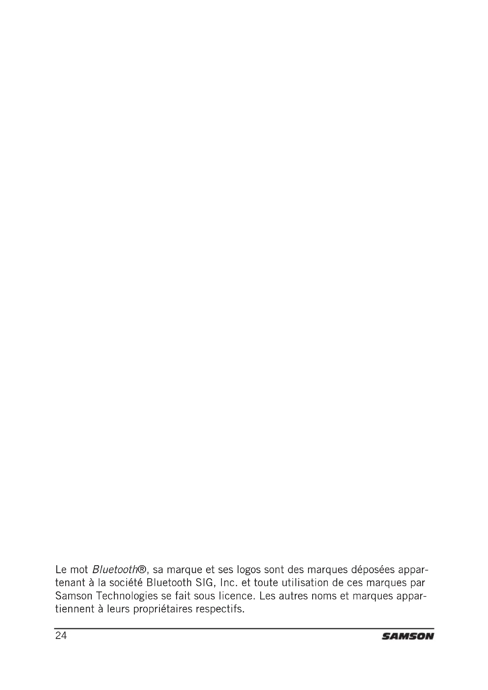 Le mot Bluetooth®, sa marque et ses logos sont des marques déposées appar- tenant à la société Bluetooth SIG, Inc. et toute utilisation de ces marques par Samson Technologies se fait sous licence. Les autres noms et marques appar- tiennent à leurs propriétaires respectifs.25 XP106 • Système de sonorisation portatif Consignes de sécurité importantes AVERTISSEMENT POUR ÉVITER TOUT RISQUE D'ÉLECTROCUTION, NE RETIREZ PAS LE COUVERCLE (NI LE DOS) DU BOITIER. CET APPAREIL NE CONTIENT PAS DE PIECES REMPLACABLES PAR L'UTILISATEUR. CONFIEZ TOUTES LES RÉPARATIONS A UN TECHNICIEN DE S.A.V. QUALIFIÉ. Le signe avec un éclair dans un triangle prévient l’utilisateur de la pré- sence d’une tension dangereuse et non isolée dans l’appareil. Cette ten- sion constitue un risque d’électrocution. Le signe avec un point d’exclamation dans un triangle prévient l’utili- sateur d’instructions importantes relatives à l’utilisation et à la mainte- nance du produit. AVIS