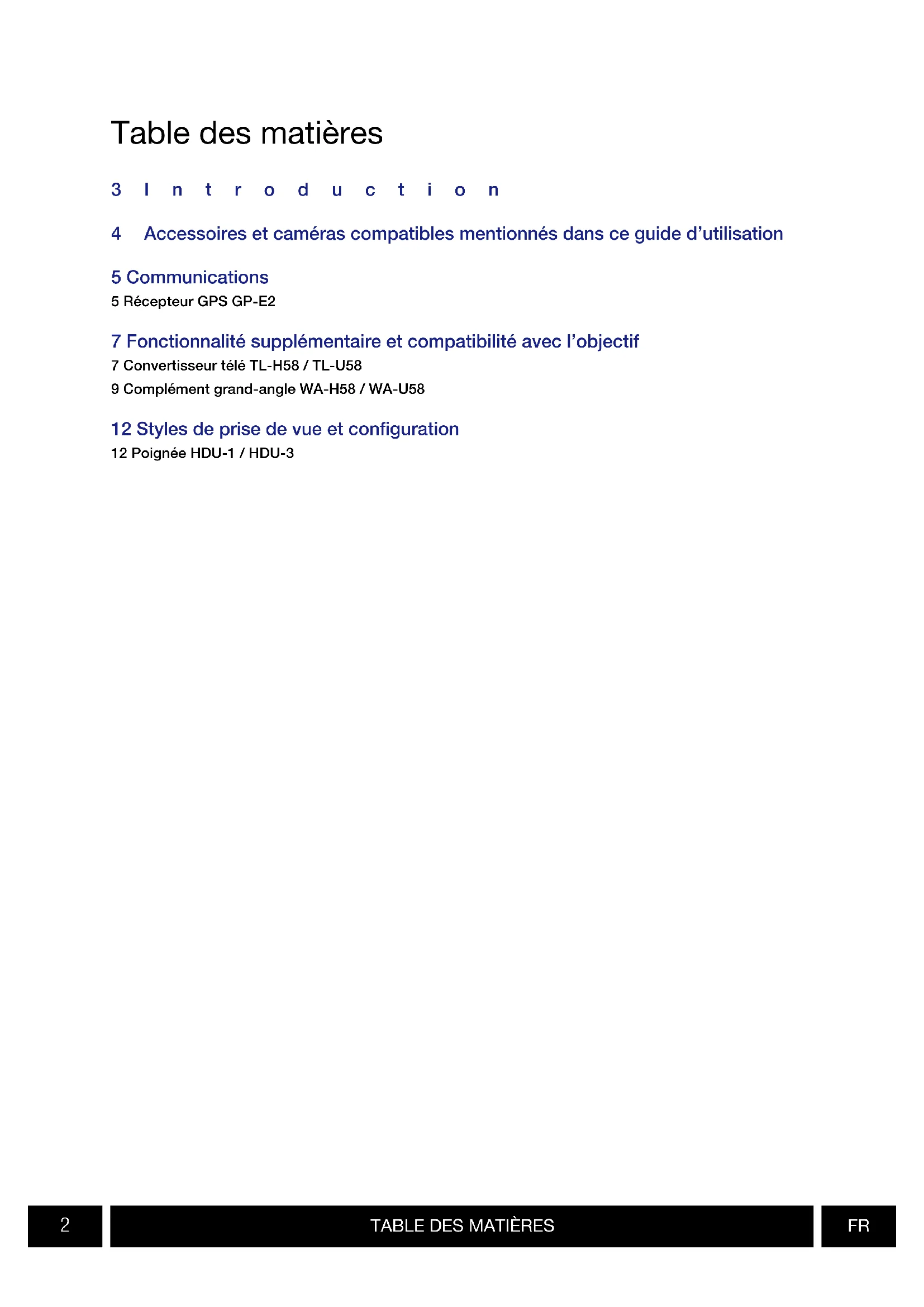 3Introduction 4 Accessoires et caméras compatibles mentionnés dans ce guide d’utilisation 5 Communications 5 Récepteur GPS GP-E2 7 Fonctionnalité supplémentaire et compatibilité avec l’objectif 7 Convertisseur télé TL-H58 / TL-U58 9 Complément grand-angle WA-H58 / WA-U58 12 Styles de prise de vue et configuration 12 Poignée HDU-1 / HDU-3 Table des matièresINTRODUCTION