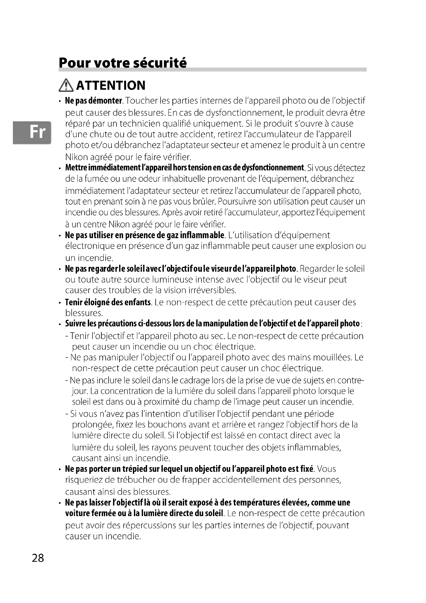 - Ne pas démonter. Toucher les parties internes de l’appareil photo ou de l’objectif peut causer des blessures. En cas de dysfonctionnement, le produit devra être réparé par un technicien qualifié uniquement. Si le produit s’ouvre à cause d’une chute ou de tout autre accident, retirez l’accumulateur de l’appareil photo et/ou débranchez l’adaptateur secteur et amenez le produit à un centre Nikon agréé pour le faire vérifier.