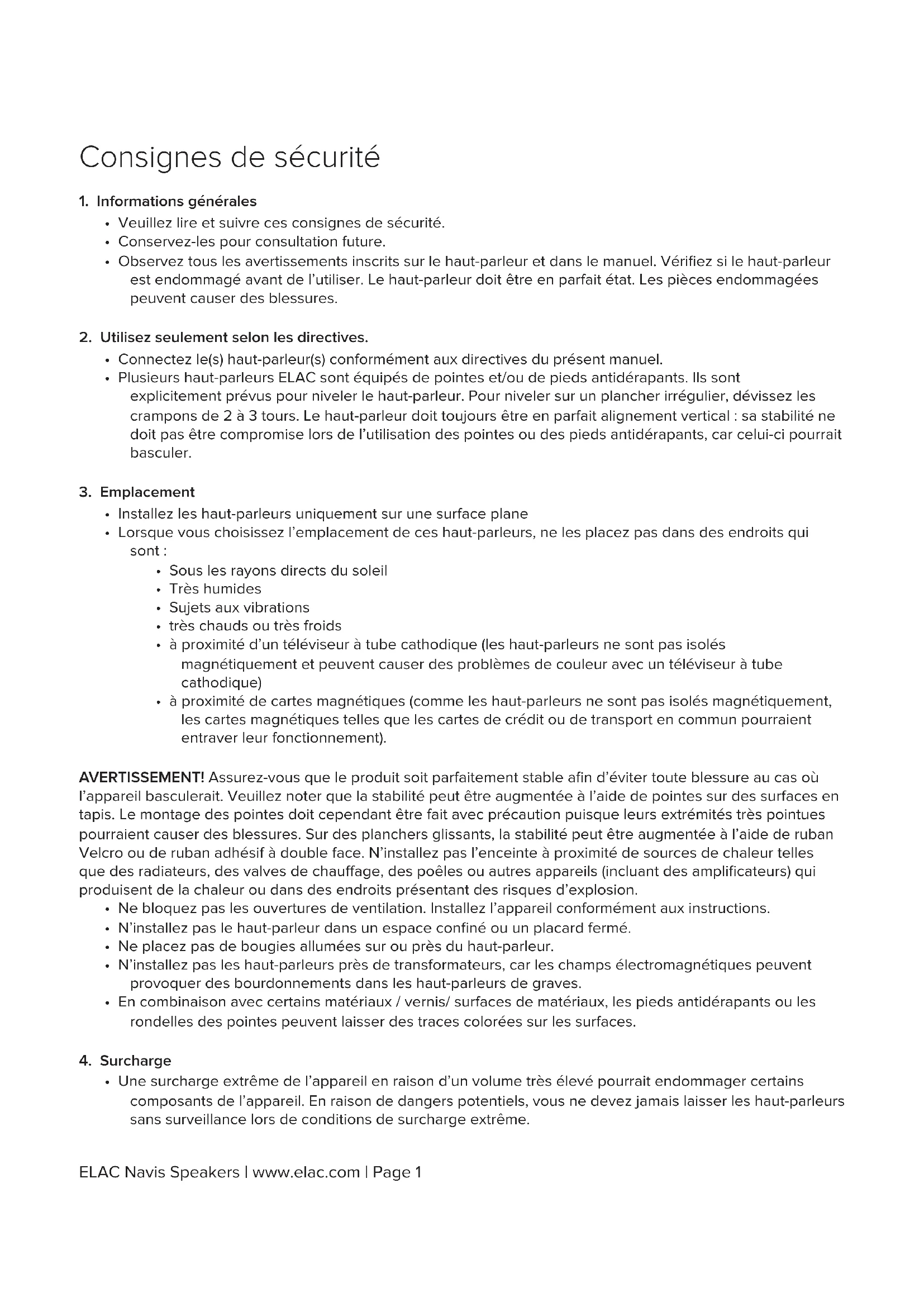 Le terme IC: » avant le numéro d’homologation radio signifie seulement que les spécifications techniques d’Industrie Canada ont été respectées. Cet équipement est conforme aux limites d’exposition aux rayonnements établies par le Conseil fédéral des communications et le ministère de l’Industrie du Canada pour un environnement non contrôlé. Cet équipement doit être installé et utilisé en respectant une distance minimale de 20 cm entre le radiateur et le corps. Cet émetteur ne doit pas être proche d’une autre antenne ou d’un autre émetteur ou fonctionner en conjonction avec ces derniers. L’utilisation de ce dispositif est autorisée seulement aux deux conditions suivantes : (1) il ne doit pas produire d’interférence (brouillage) et (2) cet appareil doit accepter tout brouillage même si ce brouillage est susceptible de compromettre le fonctionnement de l’appareil. Pour réduire les interférences radio potentielles avec d’autres utilisateurs, le type d’antenne et son gain doivent être choisis de manière à ce que la puissance isotopique rayonnée équivalente ne soit pas supérieure à celle permise pour une communication réussie. ELAC Navis Speakers | www.elac.com | Page 2Philosophie Merci d’avoir fait l’achat de ce produit ELAC. Depuis nos débuts (1926), ELAC a toujours aspiré à atteindre l’excellence. Vos nouveaux haut-parleurs ELAC sont conçus selon les normes les plus élevées, et sont dotés de composants de qualité supérieure qui sont soigneusement fabriqués pour procurer la meilleure qualité sonore de leur catégorie. Ils sont conçus par des gens passionnés dont le seul but est d’amener à votre foyer une nouvelle dimension de qualité sonore. Prendre plaisir! Avant l’utilisation Évitez d’endommager les haut-parleurs et les autres composantes :