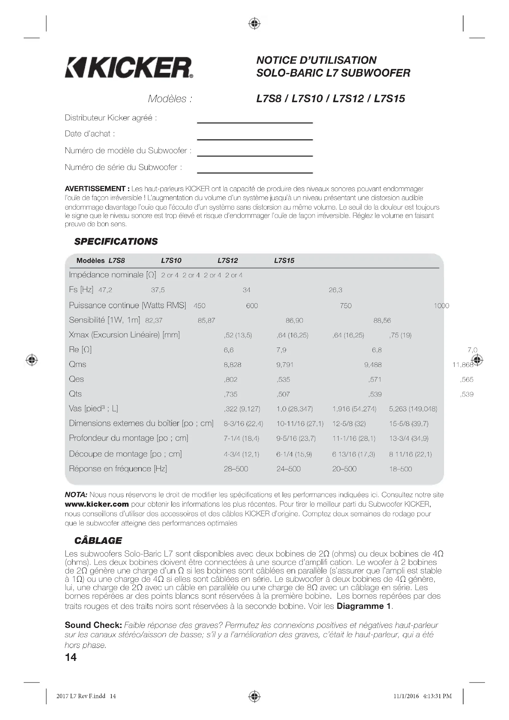 Distributeur Kicker agréé : Date d’achat : Numéro de modèle du Subwoofer : Numéro de série du Subwoofer : Modèles L7S8 L7S10 L7S12 L7S15 Impédance nominale [Ω] 2 or 4 2 or 4 2 or 4 2 or 4 Fs [Hz] 47,2 37,5 34 26,3 Puissance continue [Watts RMS] 450 600 750 1000 Sensibilité [1W, 1m] 82,37 85,87 86,90 88,56 Xmax (Excursion Linéaire) [mm] ,52 (13,5) ,64 (16,25) ,64 (16,25) ,75 (19) Re [Ω] 6,6 7,9 6,8 7,0 Qms 8,828 9,791 9,488 11,868 Qes ,802 ,535 ,571 ,565 Qts ,735 ,507 ,539 ,539 Vas [pied³; L] ,322 (9,127) 1,0 (28,347) 1,916 (54,274) 5,263 (149,048) Dimensions externes du boîtier [po; cm] 8-3/16 (22,4) 10-11/16 (27,1) 12-5/8 (32) 15-5/8 (39,7) Profondeur du montage [po; cm] 7-1/4 (18,4) 9-5/16 (23,7) 11-1/16 (28,1) 13-3/4 (34,9) Découpe de montage [po; cm] 4-3/4 (12,1) 6-1/4 (15,9) 6 13/16 (17,3) 8 11/16 (22,1) Réponse en fréquence [Hz] 28–500 24–500 20–500 18–500 L7S8 / L7S10 / L7S12 / L7S15Modèles : NOTA: Nous nous réservons le droit de modifi er les spécifi cations et les performances indiquées ici. Consultez notre site www.kicker.com pour obtenir les informations les plus récentes. Pour tirer le meilleur parti du Subwoofer KICKER, nous conseillons d’utiliser des accessoires et des câbles KICKER d’origine. Comptez deux semaines de rodage pour que le subwoofer atteigne des performances optimales Sound Check: Faible réponse des graves? Permutez les connexions positives et négatives haut-parleur sur les canaux stéréo/aisson de basse; s’il y a l’amélioration des graves, c’était le haut-parleur, qui a été hors phase.