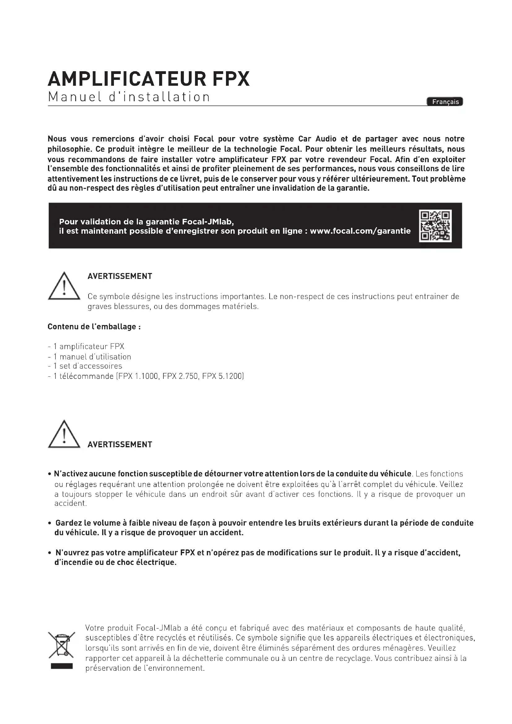 13⁄16 57⁄64 x 2 1⁄4 (300x175x57mm) Weight (kg) 4.40lbs (2kg) 4.40lbs (2kg) 8.16lbs (3.7kg) 5.62lbs (2.55kg) 9.03lbs (4,1kg) 6 – Technical specifications Warranty conditions In the event of a problem, please contact your Focal dealer. The warranty for France for all Focal equipment is 2 years. In case of faulty equipment, this must be sent at your expense, in its original packaging, to the dealer, who will test the equipment and determine the nature of the fault. If the equipment is under warranty, it will be returned to you or replaced with pre-paid shipping. If not under warranty, you will be given an estimate for repair. The warranty does not cover damage arising from improper use or incorrect wiring. Outside France, Focal equipment is covered by a guarantee with terms and conditions set locally by each country's official Focal distributor in accordance with laws in force in the territory in question.17 AMPLIFICATEUR FPX Manuel d'installation Français Votre produit Focal-JMlab a été conçu et fabriqué avec des matériaux et composants de haute qualité, susceptibles d’être recyclés et réutilisés. Ce symbole signifie que les appareils électriques et électroniques, lorsqu’ils sont arrivés en fin de vie, doivent être éliminés séparément des ordures ménagères. Veuillez rapporter cet appareil à la déchetterie communale ou à un centre de recyclage. Vous contribuez ainsi à la préservation de l’environnement. Nous vous remercions d’avoir choisi Focal pour votre système Car Audio et de partager avec nous notre philosophie. Ce produit intègre le meilleur de la technologie Focal. Pour obtenir les meilleurs résultats, nous vous recommandons de faire installer votre amplificateur FPX par votre revendeur Focal. Afin d’en exploiter l’ensemble des fonctionnalités et ainsi de profiter pleinement de ses performances, nous vous conseillons de lire attentivement les instructions de ce livret, puis de le conserver pour vous y référer ultérieurement. Tout problème dû au non-respect des règles d’utilisation peut entraîner une invalidation de la garantie. AVERTISSEMENT Ce symbole désigne les instructions importantes. Le non-respect de ces instructions peut entrainer de graves blessures, ou des dommages matériels. Contenu de l’emballage : - 1 amplificateur FPX - 1 manuel d’utilisation - 1 set d’accessoires - 1 télécommande (FPX 1.1000, FPX 2.750, FPX 5.1200) AVERTISSEMENT