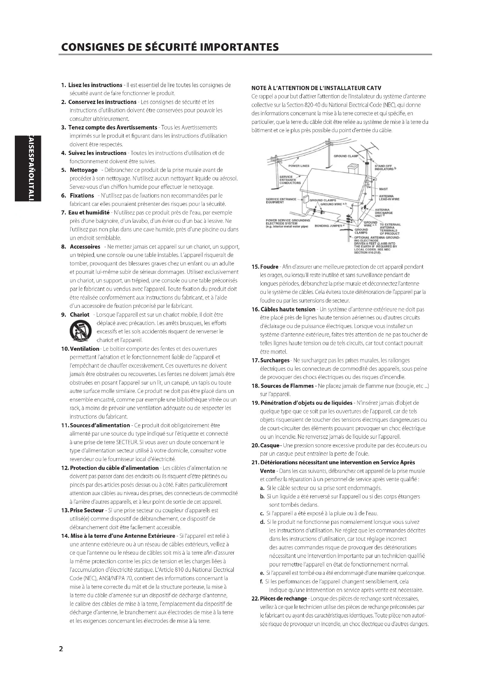 une antenne extérieure ou à un réseau de câbles extérieurs, veillez à ce que l’antenne ou le réseau de câbles soit mis à la terre an d’assurer la même protection contre les pics de tension et les charges liées à l’accumulation d’électricité statique. L’Article 810 du National Electrical Code (NEC), ANSI/NFPA 70, contient des informations concernant la mise à la terre correcte du mât et de la structure porteuse, la mise à la terre du câble d’amenée sur un dispositif de décharge d’antenne, le calibre des câbles de mise à la terre, l’emplacement du dispositif de décharge d’antenne, le branchement aux électrodes de mise à la terre et les exigences concernant les électrodes de mise à la terre. NOTE À L’ATTENTION DE L’INSTALLATEUR CATV Ce rappel a pour but d’attirer l’attention de l’installateur du système d’antenne collective sur la Section 820-40 du National Electrical Code (NEC), qui donne des informations concernant la mise à la terre correcte et qui spécie, en particulier, que la terre du câble doit être reliée au système de mise à la terre du bâtiment et ce le plus près possible du point d’entrée du câble.