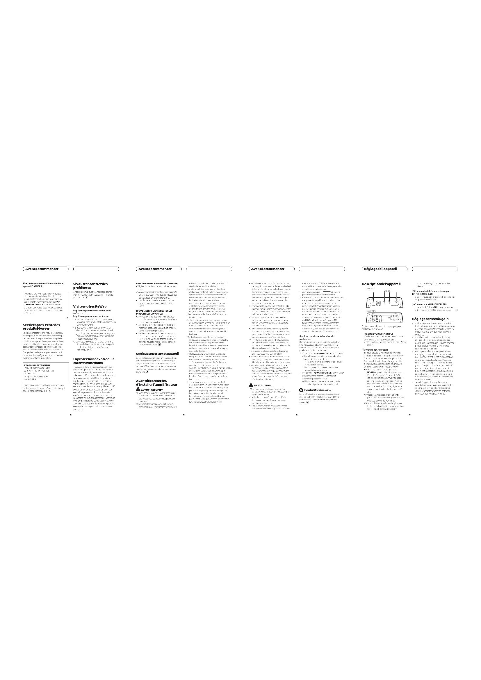 Réglage de l’appareil Nous vous remercions d’avoir acheté cet appareil PIONEER Pour garantir une utilisation correcte, lisez bien ce mode d’emploi avant d’utiliser cet ap- pareil. Il est particulièrement important que vous lisiez et respectiez les indications AT- TENTION et PRÉCAUTION de ce mode d’emploi. Conservez-le dans un endroit sûr et facilement accessible pour toute consultation ultérieure. Service après-vente des produits Pioneer Veuillez contacter le revendeur ou le distribu- teur auprès duquel vous avez acheté cet appa- reil pour le service après-vente (y compris les conditions de garantie) ou pour toute autre in- formation. Dans le cas où les informations né- cessaires ne sont pas disponibles, veuillez contacter les sociétés indiquées ci-dessous : N’expédiez pas l’appareil pour réparation à l’une des adresses figurant ci-dessous sans avoir pris contact au préalable.