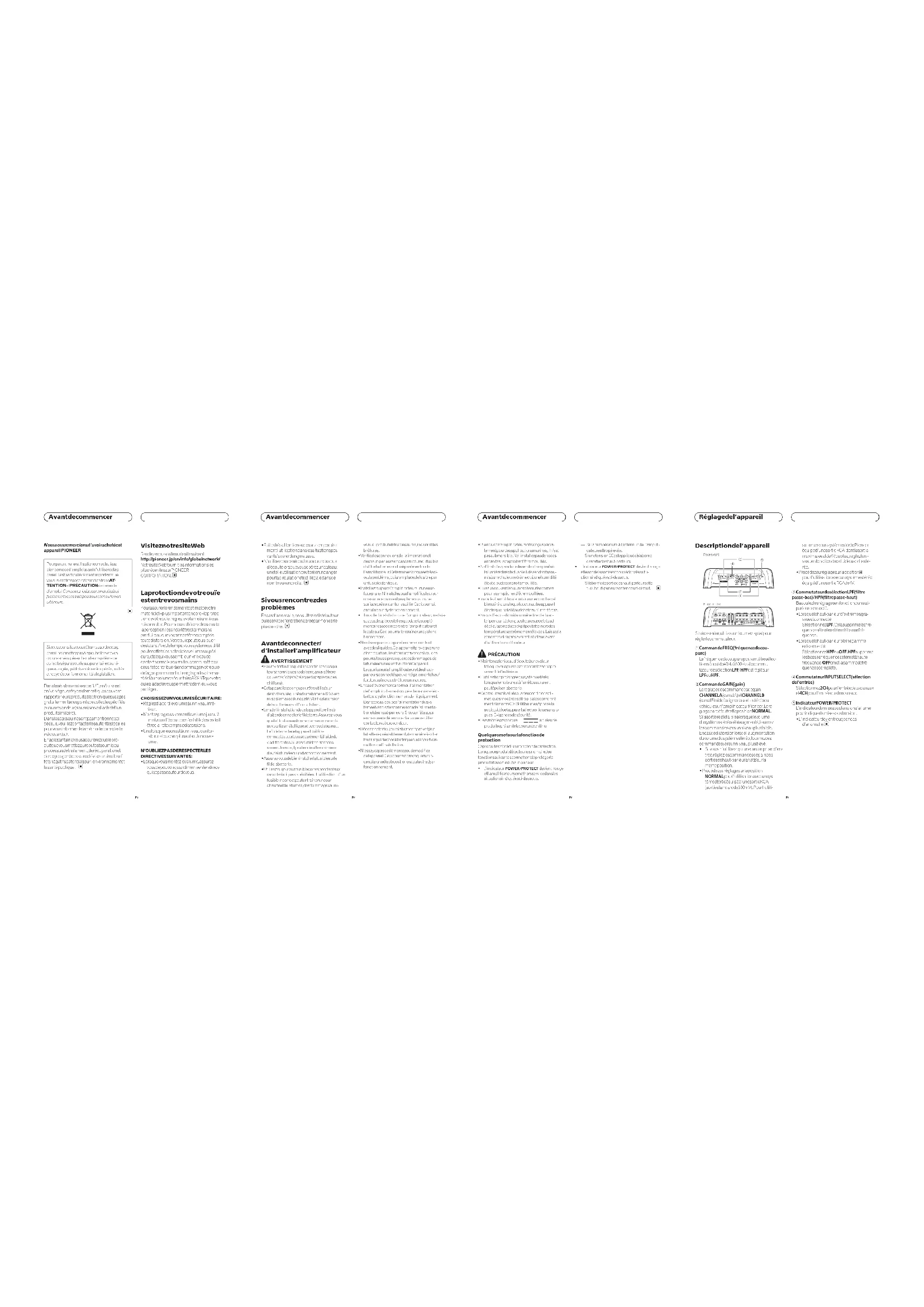 Connexion des appareils Réglage correct du gain ! Fonction de protection incluse pour éviter tout dysfonctionnement de l’appareil et/ou des haut-parleurs lié à une sortie excessive ou à une utilisation ou une connexion in- correcte. ! Lors de l’émission de sons à haut volume, etc., cette fonction coupe l’émission pen- dant quelques secondes. L’émission est ce- pendant rétablie une fois le volume de l’appareil central baissé. ! Une coupure de la sortie son peut indiquer un réglage incorrect de la commande de gain. Afin de garantir une émission sonore continue lorsque le volume de l’appareil central est élevé, réglez la commande de gain de l’amplificateur à un niveau adapté au niveau de sortie maximal de la sortie préamp de l’appareil central de manière à ce que le volume ne nécessite aucune mo- dification et à ce que les sorties excessives soient contrôlées. ! Le son de l’appareil est régulièrement coupé alors que les réglages du gain et du volume sont corrects. Dans de tels cas, veuillez contacter le Centre d’entretien agréé par Pioneer le plus proche. Commande de gain de l’appareil Niveau de préamp : 2 V (standard : 500 mV)Niveau de préamp : 4 V L’illustration ci-dessus représente le réglage de gain NORMAL. Relation entre le gain de l’amplificateur et la puissance de sortie de l’ appareil central Si le gain de l’amplificateur est augmenté de manière incorrecte, les distorsions augmen- tent sans que la puissance soit beaucoup plus importante. Forme de signal lors de l’émission à volume élevé avec la commande de gain de l’amplificateur Si la forme de signal est distordue à cause d’une sortie élevée, la puissance de sortie ne sera que légèrement modifiée même en aug- mentant le gain de l’amplificateur. <5707000013050V>19
