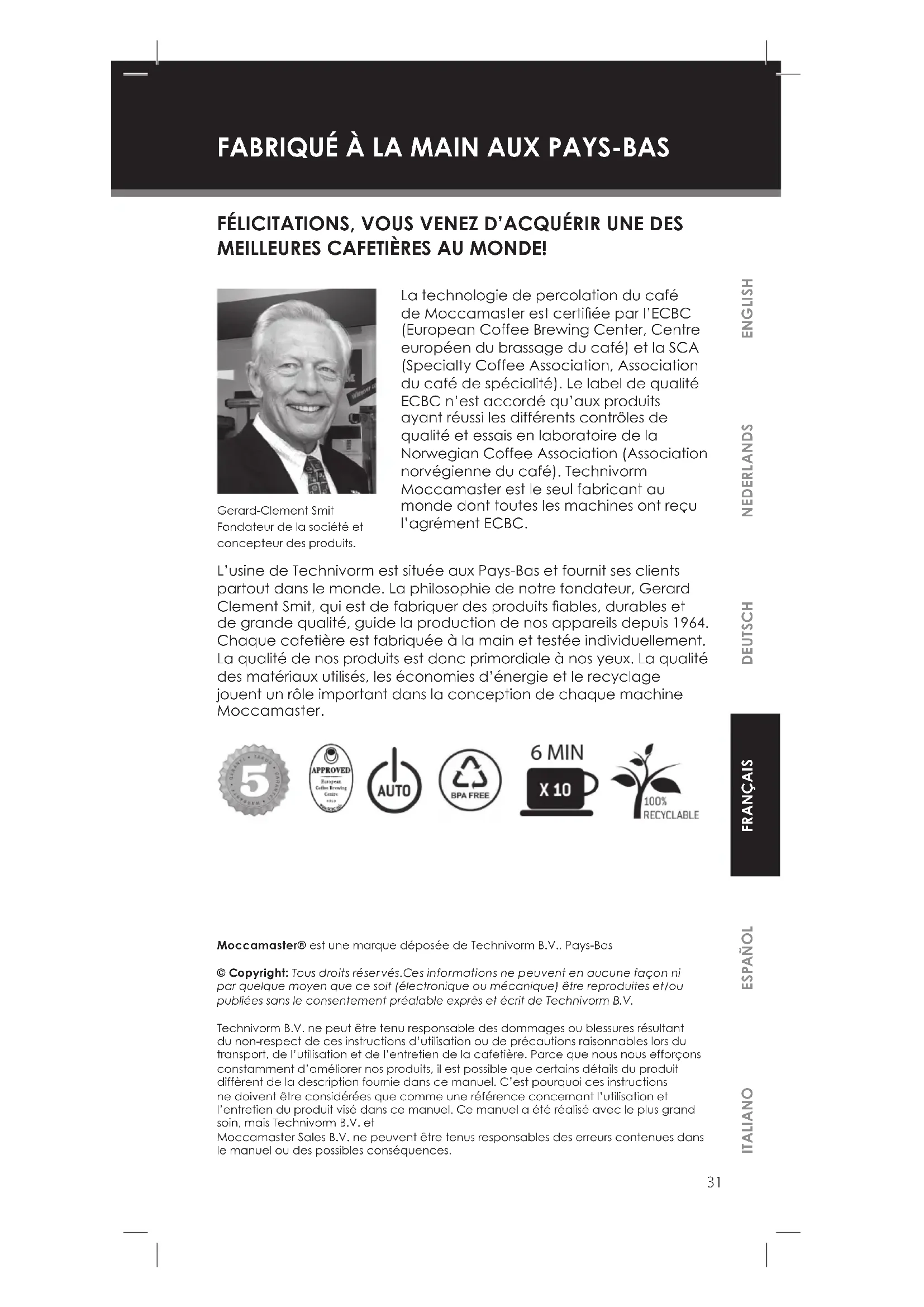 Moccamaster® est une marque déposée de Technivorm B.V., Pays-Bas © Copyright: Tous droits réservés.Ces informations ne peuvent en aucune façon ni par quelque moyen que ce soit (électronique ou mécanique) être reproduites et/ou publiées sans le consentement préalable exprès et écrit de Technivorm B.V. Technivorm B.V. ne peut être tenu responsable des dommages ou blessures résultant du non-respect de ces instructions d’utilisation ou de précautions raisonnables lors du transport, de l’utilisation et de l’entretien de la cafetière. Parce que nous nous efforçons constamment d’améliorer nos produits, il est possible que certains détails du produit diffèrent de la description fournie dans ce manuel. C’est pourquoi ces instructions ne doivent être considérées que comme une référence concernant l’utilisation et l’entretien du produit visé dans ce manuel. Ce manuel a été réalisé avec le plus grand soin, mais Technivorm B.V. et Moccamaster Sales B.V. ne peuvent être tenus responsables des erreurs contenues dans le manuel ou des possibles conséquences. La technologie de percolation du café de Moccamaster est certiée par l’ECBC (European Coffee Brewing Center, Centre européen du brassage du café) et la SCA (Specialty Coffee Association, Association du café de spécialité). Le label de qualité ECBC n’est accordé qu’aux produits ayant réussi les différents contrôles de qualité et essais en laboratoire de la Norwegian Coffee Association (Association norvégienne du café). Technivorm Moccamaster est le seul fabricant au monde dont toutes les machines ont reçu l’agrément ECBC. L’usine de Technivorm est située aux Pays-Bas et fournit ses clients partout dans le monde. La philosophie de notre fondateur, Gerard Clement Smit, qui est de fabriquer des produits ables, durables et de grande qualité, guide la production de nos appareils depuis 1964. Chaque cafetière est fabriquée à la main et testée individuellement. La qualité de nos produits est donc primordiale à nos yeux. La qualité des matériaux utilisés, les économies d’énergie et le recyclage jouent un rôle important dans la conception de chaque machine Moccamaster. Gerard-Clement Smit Fondateur de la société et concepteur des produits. FÉLICITATIONS, VOUS VENEZ D’ACQUÉRIR UNE DES MEILLEURES CAFETIÈRES AU MONDE!