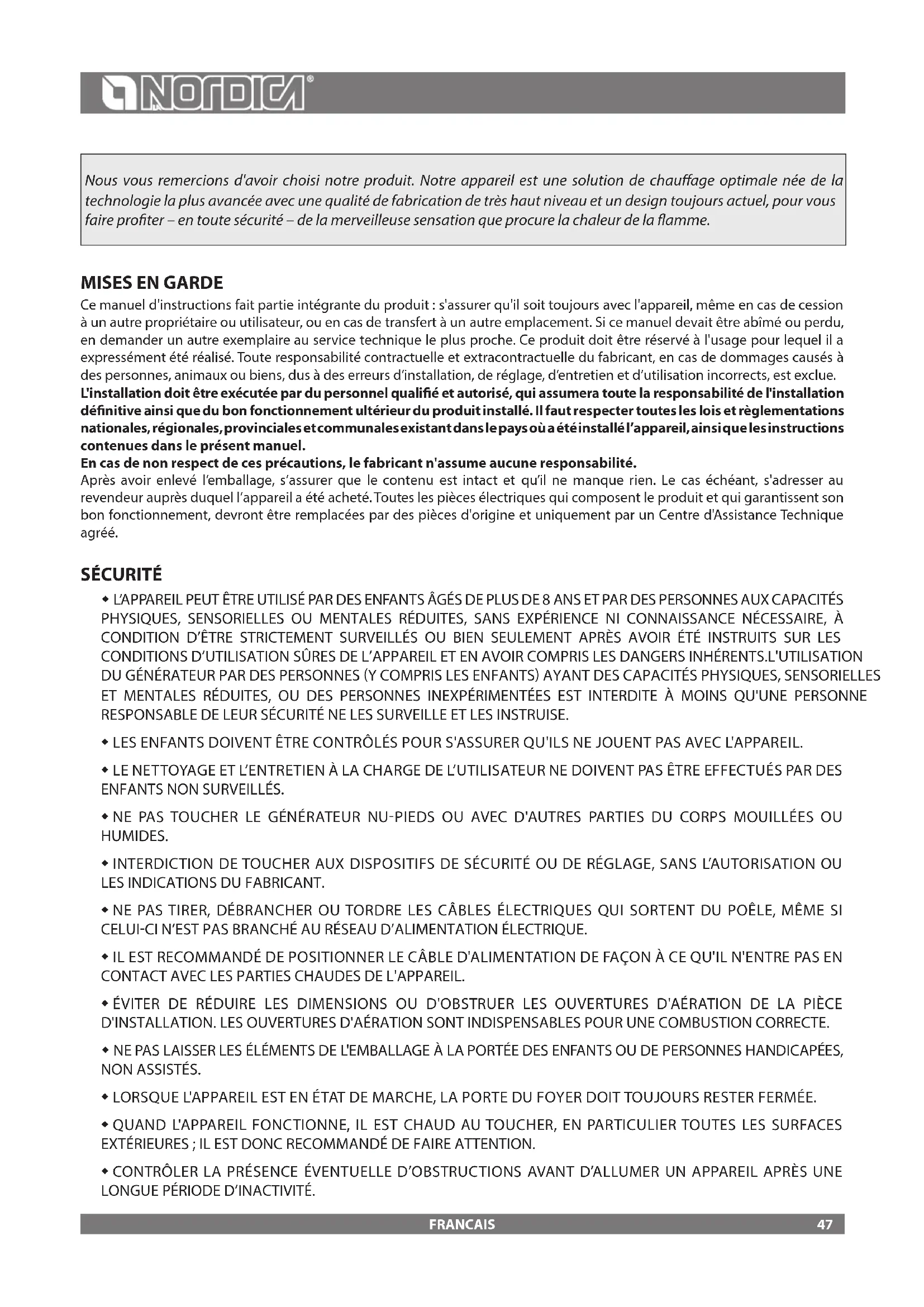 L'APPEARIL POT ETRE UTILISÉ PAR DES ENFANTS AGÉS DE PLUS DE 8 ANS ET PAR DES PERSONNES AUX CAPACITÉS PHYSIQUES, SENSORIELLES OU MENTALES RÉDUITES, SANS EXPÉRIENCE NI CONNAISSANCE NÉCESSAIRE, À CONDITION D'ÊTRÉ STRICTEMENT SURVEILLÉS OU BIEN SEULEMENT APRES AVOIR ÉTÉ INSTRUITS SUR LES CONDITIONS D'UTILISATION SûRES DE L'APPEARIL ET EN AVOIR COMPRIS LES DANGERS INHÉRENTS. L'UTILISATION DU GÉNÉRATEUR PAR DES PERSONNES (Y COMPRIS LES ENFANTS) AYANT DES CAPACITÉS PHYSIQUES, SENSORIELLES ET MENTALES RÉDUITES, OU DES PERSONNES INEXPÉRIMENTÉES EST INTERDITE À MOINS QU'UNE PERSONNE RESPONSABLE DE LEUR SECURité NE LES SURVEILLE ET LES INSTRUISE. LES ENFANTS DOIVENT ETRE CONTROLÉS POUR S'ASSURER QU'ILS NE JOUENT PAS AVEC L'APPAREIL. LE NETTOYAGE ET L'ENTRETIEN À LA CHARGE DE L'UTILISATEUR NE DOIVENT PAS ÉTRE EFFECTUÉS PAR DES ENFANTS NON SURVEILLÉS. NE PAS TOUCHER LE GENÉRATEUR NU-PIEDS OU AVEC D'AUTRES PARTIES DU CORPS MOUILLEES OU HUMIDES. INTERDICTION DE TOUCHER AUX DISPOSITIFS DE SECURITE OU DE RÉGLAGE, SANS L'AUTORISATION OU LES INDICATIONS DU FABRICANT. NE PAS TIRER, DEBRANCHER OU TORDRE LES CABLES ELECTRIQUES QUI SORTENT DU POÉLE, MÉME SI CELUI-CI N'EST PAS BRANCHÉ AU RÉSEAU D'ALIMENTATION ÉLECTRIQUE. IL EST RECOMMANDÉ DE POSITIONNER LE CÂBLE D'ALIMENTATION DE FAÇON À CE QU'IL N'ENTRE PAS EN CONTACT AVEC LES PARTIES CHAUDES DE L'APPAREIL. EVITER DE RÉDUIRE LES DIMENSIONS OU D'OBSTRUER LES OUVERTURES D'AÉRATION DE LA PIECE D'INSTALLATION. LES OUVERTURES D'AÉRATION sont INDISPENSABLES POUR UNE COMBUSTION CORRECTE. NE PAS LAISSER LES ÉLÉMENTS DE L'EMBALLAGE À LA PORTÉE DES ENFANTS OU DE PERSONNES HANDICAPÉES, NON ASSISTÉS. LORSQLE L'APPAREIL EST EN ETAT DE MARCHE, LA PORTE DU FOYER DOIT TOUJOURS RESTER FERMEE. QUAND L'APPAREIL FONCTIONNE, IL EST CHAUD AU TOUCHER, EN PARTICULIER TOUTES LES SURFACES EXTERIEURES; IL EST DONC RECOMMANDÉ DE FAIRE ATTENTION. CONTROLLER LA PRESENCE ÉVENTUELLE D'OBSTRUCTIONS AVANT D'ALLUMER UN APPAREIL APRES UNE LONGUE PÉRIODE D'INACTIVITE.