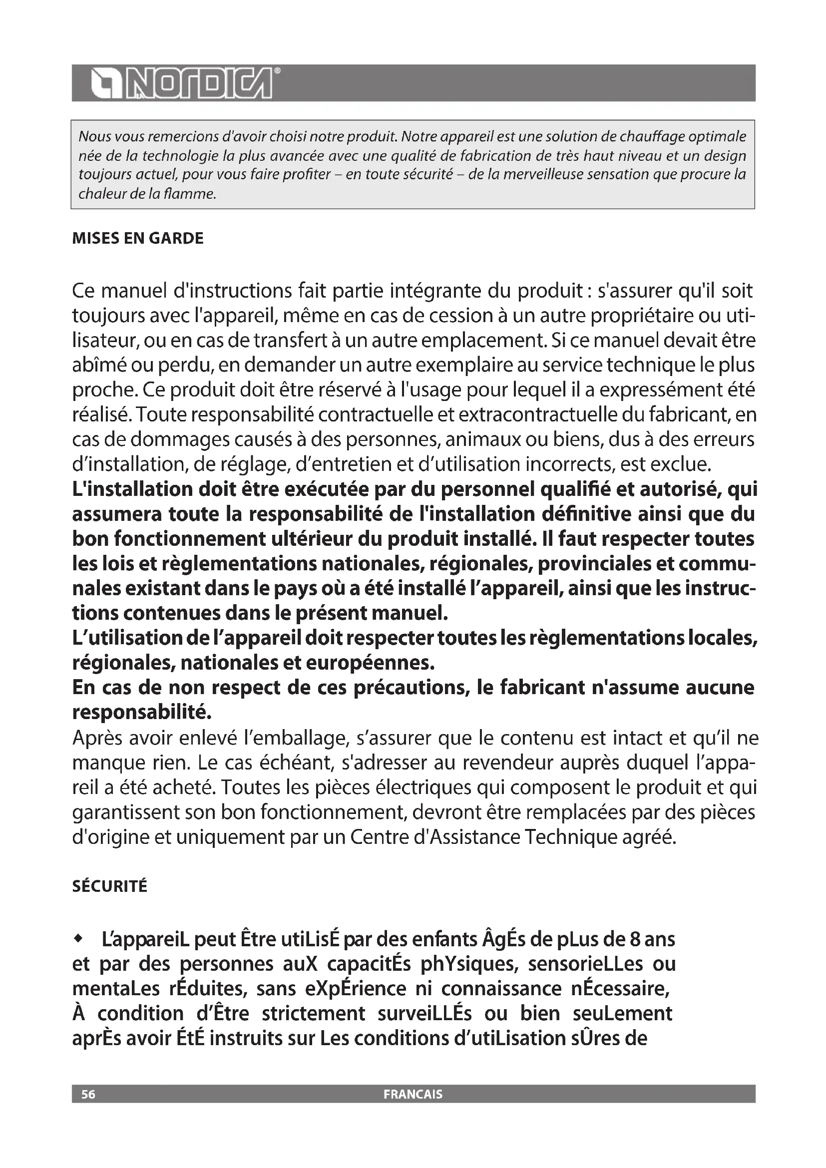 Ce manuel d'instructions fait partie intégrante du produit: s'assurer qu'il soit toujours avec l'appareil, même en cas de cession à un autre propriétaire ou uti- lisateur, ou en cas de transfert à un autre emplacement. Si ce manuel devait être abîmé ou perdu, en demander un autre exemplaire au service technique le plus proche. Ce produit doit être réservé à l'usage pour lequel il a expressément été réalisé. Toute responsabilité contractuelle et extracontractuelle du fabricant, en cas de dommages causés à des personnes, animaux ou biens, dus à des erreurs d’installation, de réglage, d’entretien et d’utilisation incorrects, est exclue. L'installation doit être exécutée par du personnel qualié et autorisé, qui assumera toute la responsabilité de l'installation dénitive ainsi que du bon fonctionnement ultérieur du produit installé. Il faut respecter toutes les lois et règlementations nationales, régionales, provinciales et commu- nales existant dans le pays où a été installé l’appareil, ainsi que les instruc- tions contenues dans le présent manuel. L’utilisation de l’appareil doit respecter toutes les règlementations locales, régionales, nationales et européennes. En cas de non respect de ces précautions, le fabricant n'assume aucune responsabilité. Après avoir enlevé l’emballage, s’assurer que le contenu est intact et qu’il ne manque rien. Le cas échéant, s'adresser au revendeur auprès duquel l’appa- reil a été acheté. Toutes les pièces électriques qui composent le produit et qui garantissent son bon fonctionnement, devront être remplacées par des pièces d'origine et uniquement par un Centre d'Assistance Technique agréé. SÉCURITÉ L’appareiL peut Être utiLisé par des enfants Âgés de pLus de 8 ans et par des personnes auX capacités phYsiques, sensorieLLes ou mentaLes réduites, sans eXpérience ni connaissance nécessaire, à condition d’Être strictement surveiLLés ou bien seuLement après avoir été instruits sur Les conditions d’utiLisation sÛres de Nous vous remercions d'avoir choisi notre produit. Notre appareil est une solution de chauage optimale née de la technologie la plus avancée avec une qualité de fabrication de très haut niveau et un design toujours actuel, pour vous faire proter – en toute sécurité – de la merveilleuse sensation que procure la chaleur de la amme. 56FRANCAIS L’appareiL et en avoir compris Les dangers inhérents.L'utiLisation du générateur par des personnes (Y compris Les enfants) aYant des capacités phYsiques, sensorieLLes et mentaLes réduites, ou des personnes ineXpérimentées est interdite à moins qu'une personne responsabLe de Leur sécurité ne Les surveiLLe et Les instruise. Les enfants doivent Être contrôLés pour s'assurer qu'iLs ne jouent pas avec L'appareiL. Le nettoYage et L’entretien à La charge de L’utiLisateur ne doivent pas Être effectués par des enfants non surveiLLés. ne pas toucher Le générateur nu-pieds ou avec d'autres parties du corps mouiLLées ou humides. iL est interdit d’apporter une queLconque modification à L’appareiL. ne pas tirer, debrancher ou tordre Les cabLes eLectriques qui sortent du produit, meme si ceLui-ci n’est pas branche au reseau d’aLimentation eLectrique. iL est recommandé de positionner Le cÂbLe d'aLimentation de façon à ce qu'iL n'entre pas en contact avec Les parties chaudes de L'appareiL. La fiche d'aLimentation doit Être accessibLe après L'instaLLation. éviter de réduire Les dimensions ou d'obstruer Les ouvertures d'aération de La pièce d'instaLLation. Les ouvertures d'aération sont indispensabLes pour une combustion correcte. ne pas Laisser Les éLéments de L'embaLLage à La portée des enfants ou de personnes handicapées, non assistés. Lorsque L'appareiL est en état de marche, La porte du foYer doit toujours rester fermée. quand L'appareiL fonctionne, iL est chaud au toucher, en particuLier toutes Les surfaces eXtérieures ; iL est donc recommandé de faire attention. contrôLer La présence éventueLLe d’obstructions avant d’aLLumer un appareiL après une Longue période d’inactivité. Le générateur a été conçu pour se régLer automatiquement dans des conditions particuLières de fonctionnement. Le générateur a été conçu pour Être utiLisé dans n’importe queLLe condition cLimatique. cependant, en cas de cLimat particuLièrement défavorabLe (vent fort, geL), Les sYstèmes de 57FRANCAIS sécurité pourraient se décLencher, provoquant ainsi L’arrÊt du générateur. si ceLa se vérifie, contacter Le service d’assistance technique et surtout ne pas désactiver Les sYstèmes de sécurité. en cas d'incendie du conduit de fumée, se munir d'eXtincteurs pour étouffer Les fLammes ou appeLer Les pompiers. cet appareiL ne doit pas Être utiLisé comme incinérateur de déchets. n'utiLiser aucun Liquide infLammabLe pour L'aLLumage au cours du rempLissage, veiLLer à ce que Le sac de peLLets n'entre pas en contact avec L'appareiL. Les faïences sont des produits artisanauX et en tant que teLs, eLLes peuvent présenter des micro-grumeauX, des craqueLures et des imperfections chromatiques. ces caractéristiques en démontrent La vaLeur. étant donné Leur coefficient de diLatation différent, L'émaiL et La faïence produisent des micro- fissures (craqueLures) qui témoignent de Leur authenticité. pour nettoYer Les faïences, nous conseiLLons d'utiLiser un chiffon douX et sec. si un détergent ou du Liquide est utiLisé, ce dernier pourrait pénétrer à L'intérieur des fissures et Les mettre en évidence. 58FRANCAIS AVERTISSEMENTS GENERAUX La responsabilité de La société La NORDICA S.p.a. se limite à la fourniture de l’appareil. SON INSTALLATION DOIT ÊTRE RÉALISÉE DANS LES RÈGLES DE L’ART, SELON LES PRÉSENTES INSTRUCTIONS ET LES RÈGLES DE LA PROFESSION, PAR DU PERSONNEL QUALIFIÉ, QUI AGIT AU NOM DE SOCIÉTÉS APTES À ASSUMER L’ENTIÈRE