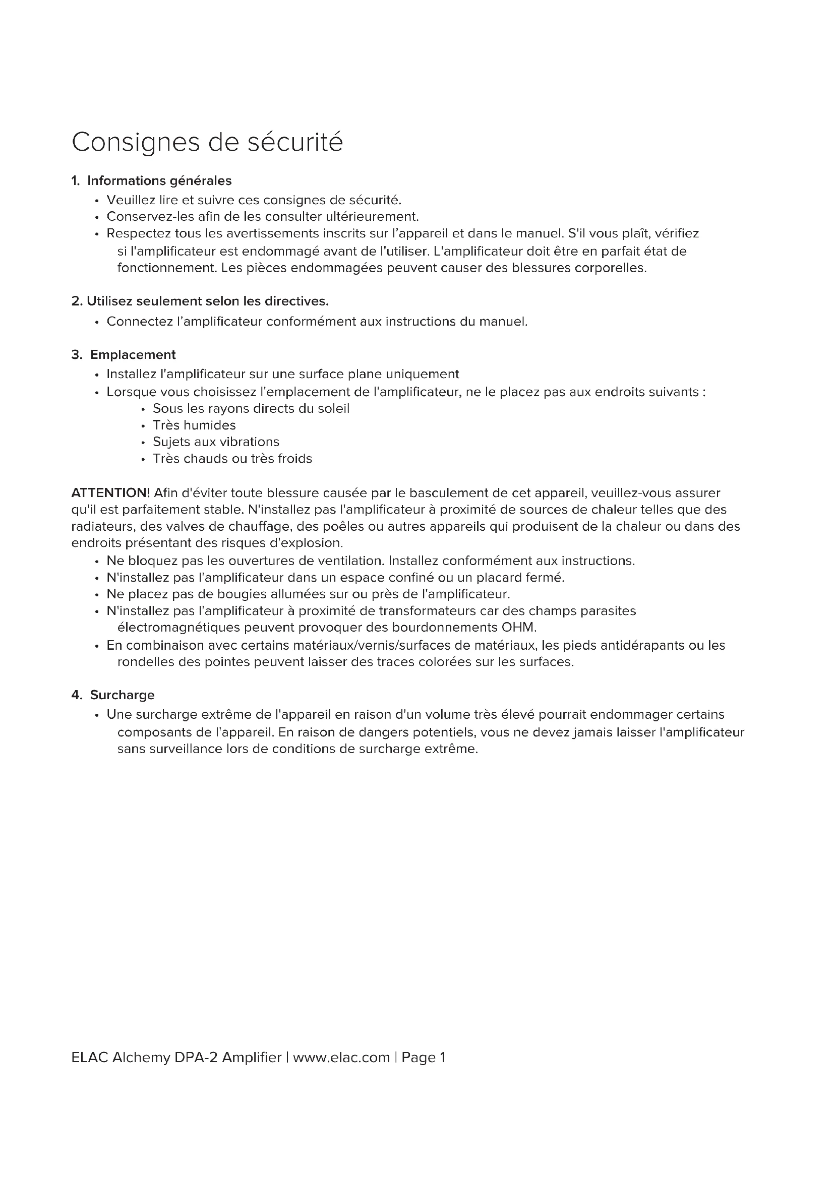 - L’emballage est fabriqué à partir de matériaux recyclables. Mettez l’appareil au rebut de façon écologique. En fin de vie, éliminez l’amplificateur avec les déchets électroniques. Les haut-parleurs doivent être recyclés conformément à la réglementation locale. Informez-vous auprès de vos autorités locales pour obtenir de plus amples renseignements sur le recyclage, car l’appareil contient des matières premières précieuses. ELAC Alchemy DPA-2 Amplifier | www.elac.com | Page 2Philosophie Merci d’avoir fait l’achat de ce produit ELAC. Depuis nos débuts en 1926, ELAC a toujours aspiré à atteindre l’excellence. Votre nouvel amplificateur ELAC est conçu selon les normes les plus élevées. Il est doté de composantes de qualité supérieure qui sont soigneusement fabriqués pour procurer la meilleure qualité sonore de leur catégorie. Ils sont conçus par des gens passionnés dont le seul but est d’amener à votre foyer une nouvelle dimension de qualité sonore. Profitez-en! Avant l’utilisation Évitez d’endommager les haut-parleurs et les autres composantes : Déballez soigneusement l’amplificateur pour éviter d’endommager physiquement votre amplificateur. Assurez- vous que votre équipement est éteint avant de brancher les haut-parleurs. ELAC Alchemy DPA-2 Amplifier | www.elac.com | Page 3Commandes et voyants lumineux