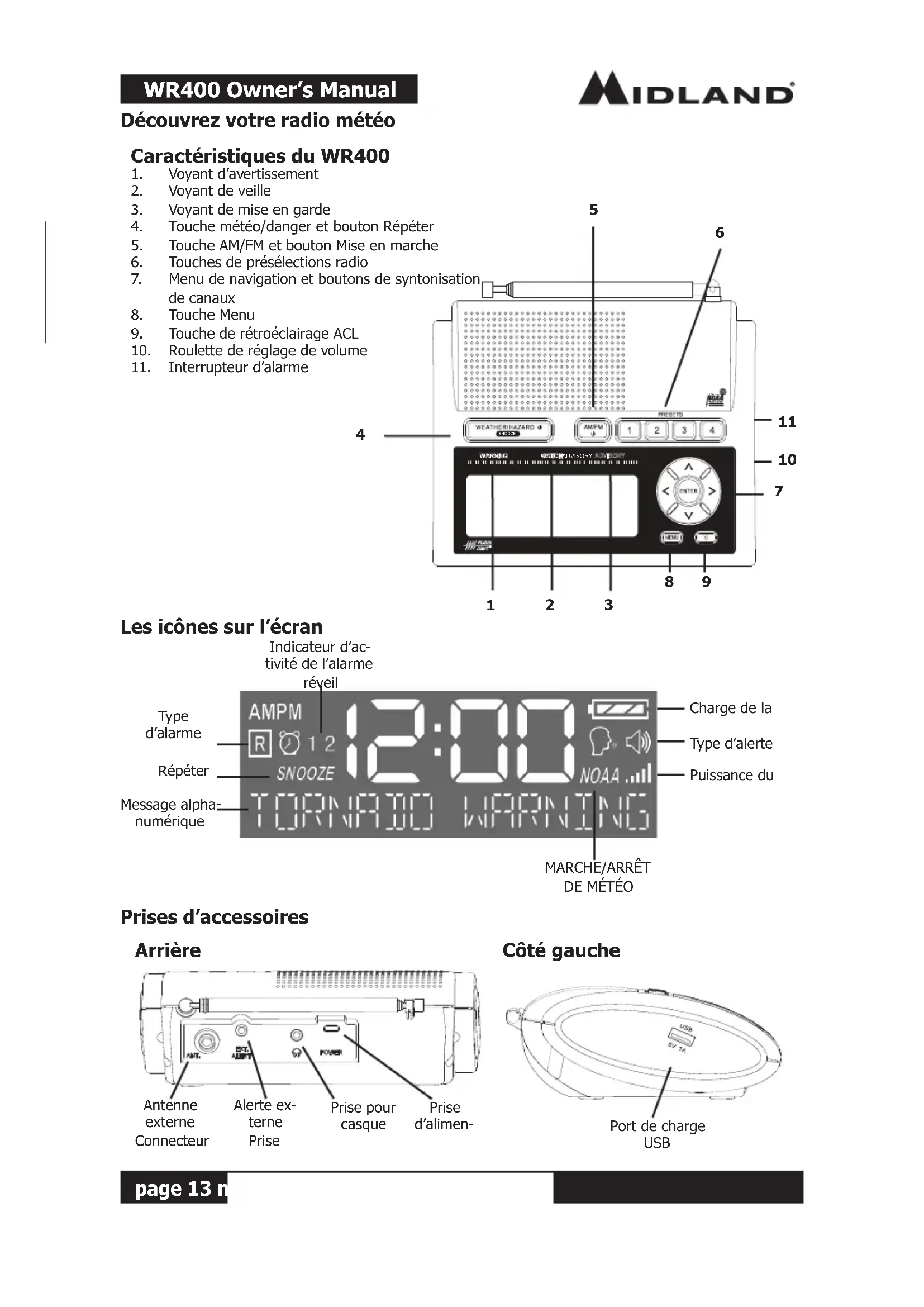 menu de conguration. Désormais, lorsque vous appuyez sur le bouton du gradateur de rétroéclairage, le rétroéclairage de l’écran ACL s’ajustera selon la luminosité que vous aurez choisie.WR400 Owner’s Manual page 19 midlandusa.com English François Español Dépannage Problème SuggestionPas d’alimentationAssurez-vous que l’adaptateur c.a. est correctement branché dans les deux prises c.c. à l’arrière de la radio-météo et dans la prise murale. Assurez-vous que les batteries sont installées en cas de défaillance de l’alimentation.Aucun sonVérifier le réglage du VOLUME pour s’assurer que le volume est réglé à un volume audible.Aucune radiodiffusion de météo lorsque vous appuyez sur la touche WEATHER/SNOOZE (MÉTÉO/RÉPÉTER)Assurez-vous que l’antenne télescopique est déployée et complètement éten- due. Si vous utilisez une antenne externe, s’assurer qu’elle est correctement con-nectée.Veiller à ce que la radio soit réglée sur le canal météo NWS en usage dans votre région.Contactez NWS pour s’assurer qu’ils diffusent actuellement.Si vous êtes dans une structure métallique, assurez-vous que vous êtes près d’une fenêtre.Si vous êtes dans une zone où le signal est faible, vous aurez besoin d’une antenne externe.La radio ne répond pas correctement aux diffusions d’alertes de météo NWSVérifiez que vous avez programmé correctement le ou les bons codes de comté S.A.M.E.Vérifiez auprès de NWS pour confirmer que la tour diffuse. Énoncé de conformité de la FCC (CFC) Ce dispositif est conforme à la section 15 des règlements de la CFC. Son fonctionnement est assujetti aux deux conditions suivantes : (1) cet appareil ne doit pas causer d’interférences nuisibles, et (2) doit accepter toute interférence reçue, y compris les interférences pouvant entraîner un dysfonctionnement.REMARQUE : TOUT CHANGEMENT OU MODIFICATION N’AYANT PAS ÉTÉ EXPRESSÉMENT APPROUVÉ(E) PAR LA PARTIE RESPONSABLE DE LA CONFORMITÉ RISQUE DE RETIRER AU PROPRIÉTAIRE DUDIT APPAREIL SON DROIT DE L’UTILISER. Cet appareil comprend des émetteur (s)/récepteur (s) qui sont conformes aux CNR d’Innovation, Sciences et Développement économique Canada applicables aux appareils radio exempts de licence. Son fonctionnement est assujetti aux deux conditions suivantes : (1) cet appareil ne doit pas causer d’interférences nuisibles, et (2) doit accepter toute interférence reçue, y compris les interférences pouvant entraîner un dysfonctionnement.English François Español WR400 Owner’s Manual page 20 midlandusa.com English François Español GARANTIE LIMITÉE (États-Unis et Canada) Sous réserve des exclusions énoncées ci-dessous, Corporation Radio Midland réparera ou remplacera, à son gré et sans frais, tout émetteur-récepteur radio d’alerte météorologique Midland qui tombe en panne en raison d’un défaut de matériel ou de fabrication dans l’année suivant l’achat initial du consommateur. Cette garantie ne s’applique pas aux dommages causés par l’eau, aux fuites de batterie, à l’abus ou à la mauvaise utilisation d’accessoires non homologués, à l’entretien ou à la modification non autorisés ou aux produits modi- fiés. Les accessoires sont garantis 90 jours à compter de la date d’achat, y compris les antennes, chargeurs ou écouteurs. Cette garantie n’inclut pas le coût de la main-d’œuvre pour l’enlèvement ou la réinstallation du produit dans un véhicule ou autre support. TOUTE GARANTIE IMPLICITE, Y COMPRIS, SANS LIMITATION, LES GARANTIES DE QUALITÉ MARCHANDE ET D’ADÉQUATION À UN USAGE PARTICULIER, EST LIMITÉE COMME DANS LES PRÉSENTES ET À LA DURÉE DE LA GARANTIE LIMITÉE, SINON LA RÉPARATION OU LE REMPLACEMENT CONFORMÉMENT À CETTE GARANTIE LIMITÉE EST LE RECOURS EXCLUSIF DU CONSOMMATEUR ET SONT OFFERTS AU LIEU DE TOUTE AUTRE GARANTIE, EXPLICITE OU IMPLICITE. EN AUCUN CAS MIDLAND NE SERA TENU RESPONSABLE, QUE CE SOIT À LA SUITE D’UN CONTRAT OU LA CONSÉQUENCE D’UN ACTE DÉLICTUEUX (Y COMPRIS, MAIS SANS S’Y LIMITER À LA NÉGLIGENCE, NÉGLIGENCE GRAVE, BLESSURES, DÉGÂTS MATÉRIELS ET LA MORT) POUR DES DOMMAGES EXCÉDANT LE PRIX D’ACHAT DU PRODUIT OU ACCESSOIRE, OU DE DOMMAGES INDIRECTS, DOMMAGE SPÉCIAL OU INDIRECT DE QUELQUE NATURE QUE CE SOIT OU PERTE DE REVENUS OU DE PROFITS, PERTE DE CHIFFRE D’AFFAIRES, DE LA PERTE D’INFORMATIONS OU DE DONNÉES OU AUTRE PERTE FINANCIÈRE RÉSULTANT DE OU EN RELATION AVEC LA CAPACITÉ OU L’INCAPACITÉ D’UTILISER LES PRODUITS OU ACCESSOIRES, DANS TOUTE LA MESURE OÙ CES DOMMAGES PEUVENT ÊTRE DÉCLINÉS PAR LA LOI. Pour les produits achetés aux États-Unis : L’exécution de toute obligation en vertu de cette garantie peut être obtenue en retournant le produit garanti, le fret payé d’avance, ainsi qu’une preuve d’achat à : Midland Radio Corporation Warranty Service Department 5900 Parretta Drive Kansas City, MO 64120 Cette garantie vous donne des droits légaux spécifiques, et vous pouvez aussi avoir d’autres droits qui varient selon les états ou les provinces. Remarque : La garantie ci-dessus s’applique uniquement aux marchandises achetées aux États-Unis d’Amérique ou l’un des territoires ou possessions de celui-ci, ou d’un échange militaire américain. Pour les produits achetés au Canada: L’exécution de toute obligation en vertu de cette garantie peut être obtenue en retournant le produit garanti, accompagné d’une preuve d’achat, à votre lieu d’achat au Canada. Cette garantie vous donne des droits juridiques spécifiques. Des droits de garantie supplémentaires peuvent être prévus par la loi dans certains cas au Canada. Service : Si vous avez un problème qui, à votre avis, nécessite un entretien, veuillez d’abord consulter la section FAQ de notre site Web, consulter votre manuel du propriétaire ou appeler un technicien d’entretien et lui parler. De nombreux problèmes peuve
