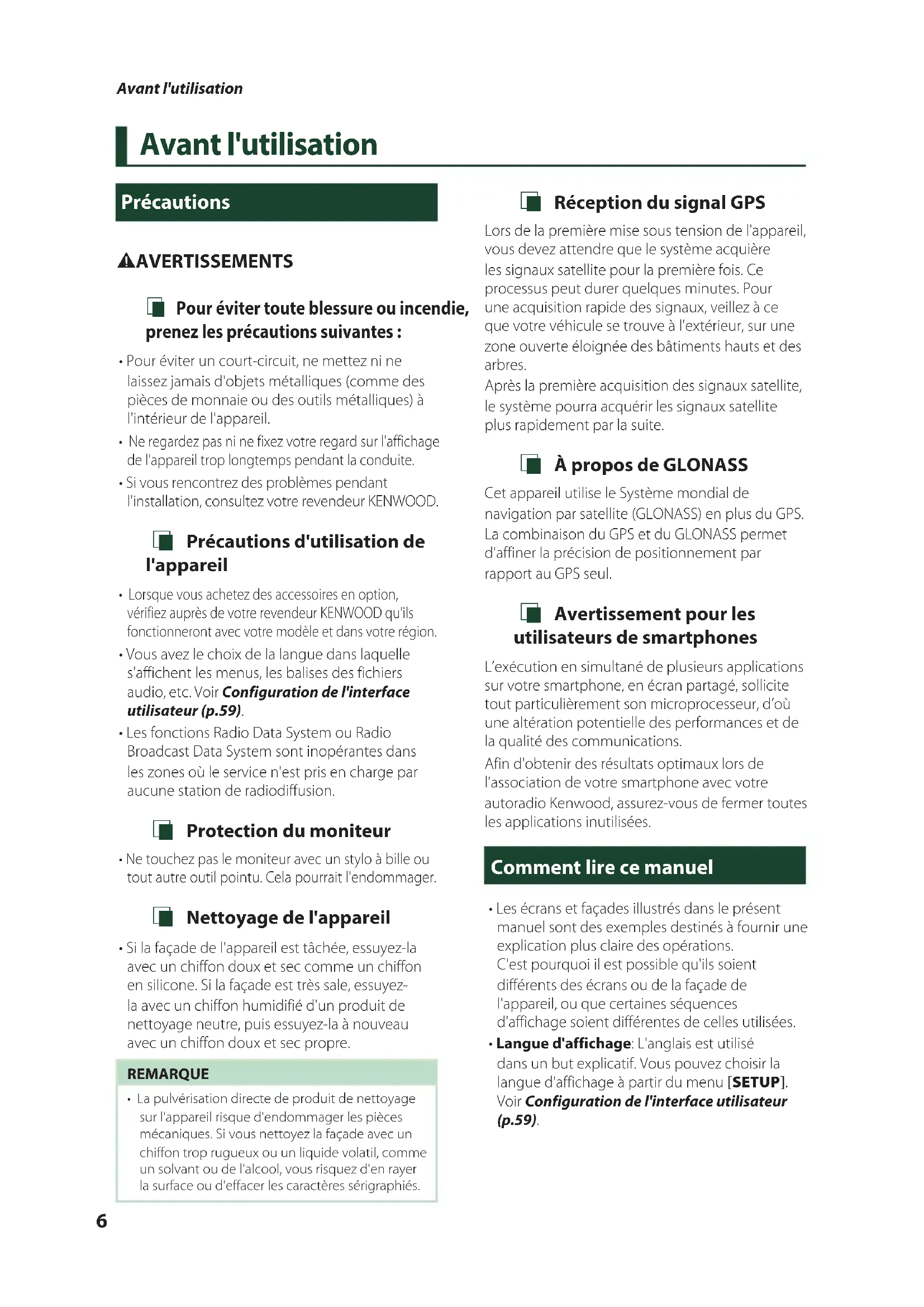 - Si la façade de l'appareil est tâchée, essuyez-la avec un chiffon doux et sec comme un chiffon en silicone. Si la façade est très sale, essuyez-la avec un chiffon humidifié d'un produit de nettoyage neutre, puis essuyez-la à nouveau avec un chiffon doux et sec propre.REMARQUE• La pulvérisation directe de produit de nettoyage sur l'appareil risque d'endommager les pièces mécaniques. Si vous nettoyez la façade avec un chiffon trop rugueux ou un liquide volatil, comme un solvant ou de l'alcool, vous risquez d'en rayer la surface ou d'effacer les caractères sérigraphiés. Ñ Réception du signal GPS Lors de la première mise sous tension de l'appareil, vous devez attendre que le système acquière les signaux satellite pour la première fois. Ce processus peut durer quelques minutes. Pour une acquisition rapide des signaux, veillez à ce que votre véhicule se trouve à l'extérieur, sur une zone ouverte éloignée des bâtiments hauts et des arbres.Après la première acquisition des signaux satellite, le système pourra acquérir les signaux satellite plus rapidement par la suite. Ñ À propos de GLONASS Cet appareil utilise le Système mondial de navigation par satellite (GLONASS) en plus du GPS.La combinaison du GPS et du GLONASS permet d'affiner la précision de positionnement par rapport au GPS seul. Ñ Avertissement pour les utilisateurs de smartphones L’exécution en simultané de plusieurs applications sur votre smartphone, en écran partagé, sollicite tout particulièrement son microprocesseur, d’où une altération potentielle des performances et de la qualité des communications.Afin d'obtenir des résultats optimaux lors de l'association de votre smartphone avec votre autoradio Kenwood, assurez-vous de fermer toutes les applications inutilisées. Comment lire ce manuel