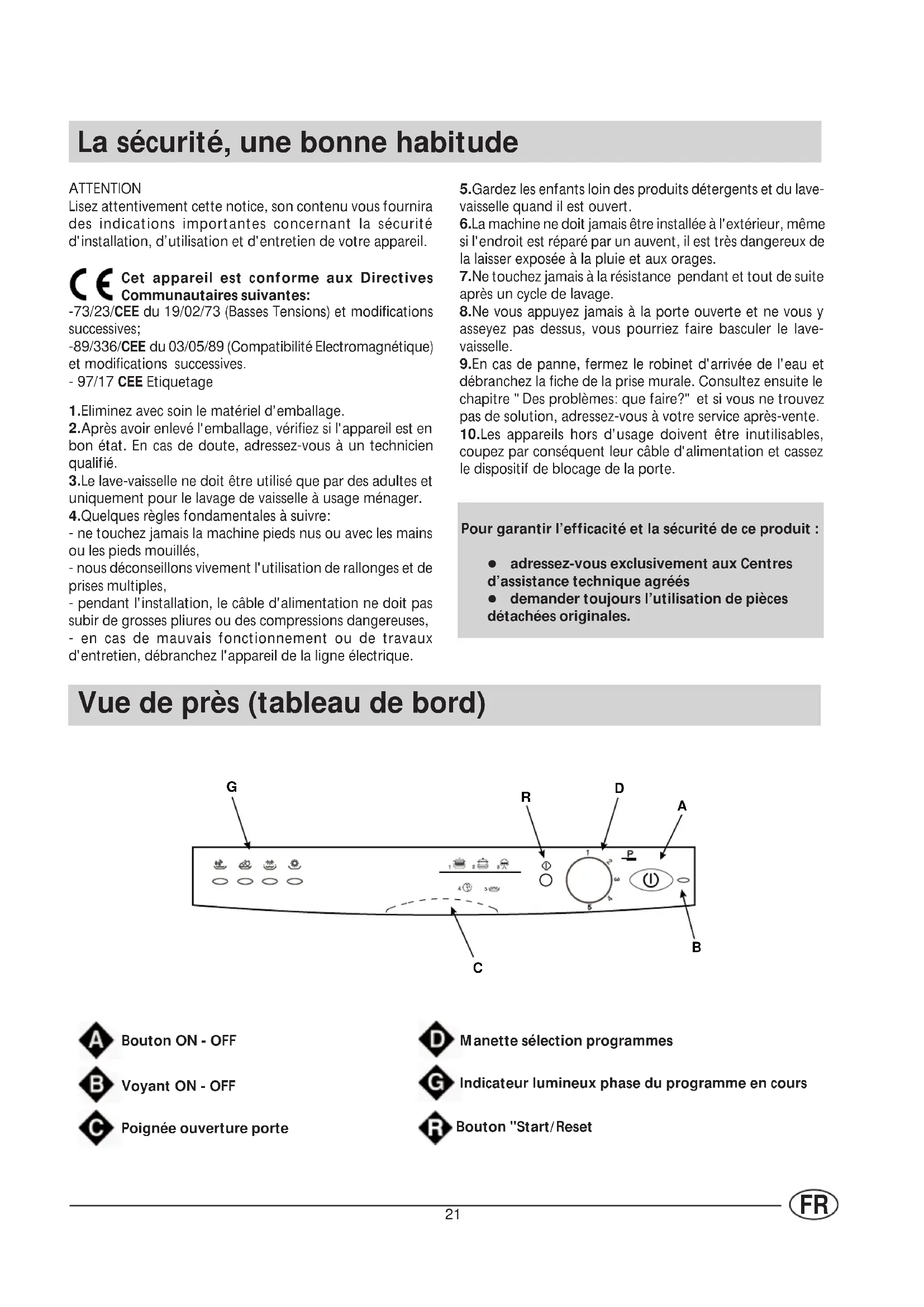 La sécurité, une bonne habitude ATTENTION Lisez attentivement cette notice, son contenu vous fournira des indications importantes concernant la sécurité d'installation, d’utilisation et d'entretien de votre appareil. Cet appareil est conforme aux Directives Communautaires suivantes: -73/23/CEE du 19/02/73 (Basses Tensions) et modifications successives; -89/336/CEE du 03/05/89 (Compatibilité Electromagnétique) et modifications successives. - 97/17 CEE Etiquetage 1.Eliminez avec soin le matériel d'emballage. 2.Après avoir enlevé l'emballage, vérifiez si l'appareil est en bon état. En cas de doute, adressez-vous à un technicien qualifié. 3.Le lave-vaisselle ne doit être utilisé que par des adultes et uniquement pour le lavage de vaisselle à usage ménager. 4.Quelques règles fondamentales à suivre: - ne touchez jamais la machine pieds nus ou avec les mains ou les pieds mouillés, - nous déconseillons vivement l'utilisation de rallonges et de prises multiples, - pendant l'installation, le câble d'alimentation ne doit pas subir de grosses pliures ou des compressions dangereuses, - en cas de mauvais fonctionnement ou de travaux d'entretien, débranchez l'appareil de la ligne électrique. Vue de près (tableau de bord) 5.Gardez les enfants loin des produits détergents et du lave- vaisselle quand il est ouvert. 6.La machine ne doit jamais être installée à l'extérieur, même si l'endroit est réparé par un auvent, il est très dangereux de la laisser exposée à la pluie et aux orages. 7.Ne touchez jamais à la résistance pendant et tout de suite après un cycle de lavage. 8.Ne vous appuyez jamais à la porte ouverte et ne vous y asseyez pas dessus, vous pourriez faire basculer le lave- vaisselle. 9.En cas de panne, fermez le robinet d'arrivée de l'eau et débranchez la fiche de la prise murale. Consultez ensuite le chapitre "Des problèmes: que faire?" et si vous ne trouvez pas de solution, adressez-vous à votre service après-vente. 10.Les appareils hors d'usage doivent être inutilisables, coupez par conséquent leur câble d'alimentation et cassez le dispositif de blocage de la porte. Bouton ON - OFF Voyant ON - OFF Poignée ouverture porte Pour garantir l’efficacité et la sécurité de ce produit : l adressez-vous exclusivement aux Centres d’assistance technique agréés l demander toujours l’utilisation de pièces détachées originales. Manette sélection programmes Indicateur lumineux phase du programme en cours Bouton "Start/Reset