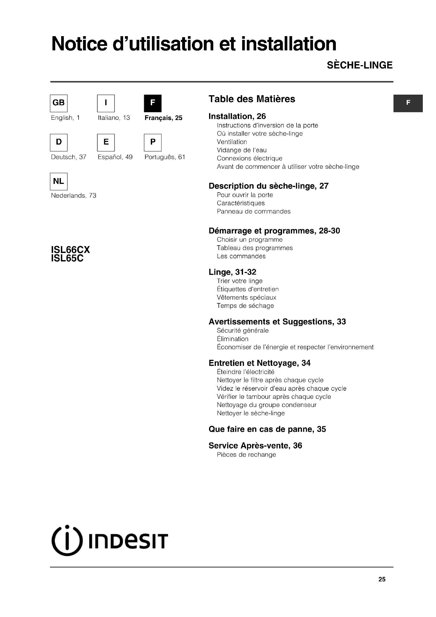 Programmi consigliati per il test comparativo di EN61121 ! Nota: questo non è un elenco completo di opzioni di programma (vedere la sezione Avvio e programmi). Programma Programma da selezionare Dimensione carico (EN61121) Asciugatura cotone 2 Cotone - Asciugatura appendino 6 kg Asciugatura cotone stiratura 3 Cotone - Pronti per la stiratura 6 kg Tessuto di facile cura 4 Sintetici - Asciugatura armadio 3 kgTable des Matières SÈCHE-LINGE ISL66CX ISL65C Notice d’utilisation et installation Installation, 26 Instructions d’inversion de la porte Où installer votre sèche-linge Ventilation Vidange de l’eau Connexions électrique Avant de commencer à utiliser votre sèche-linge Description du sèche-linge, 27 Pour ouvrir la porte Caractéristiques Panneau de commandes Démarrage et programmes, 28-30 Choisir un programme Tableau des programmes Les commandes Linge, 31-32 Trier votre linge Étiquettes d’entretien Vêtements spéciaux Temps de séchage Avertissements et Suggestions, 33 Sécurité générale Élimination Économiser de l’énergie et respecter l’environnement Entretien et Nettoyage, 34 Éteindre l’électricité Nettoyer le filtre après chaque cycle Videz le réservoir d’eau après chaque cycle Vérifier le tambour après chaque cycle Nettoyage du groupe condenseur Nettoyer le sèche-linge Que faire en cas de panne, 35 Service Après-vente, 36 Pièces de rechange