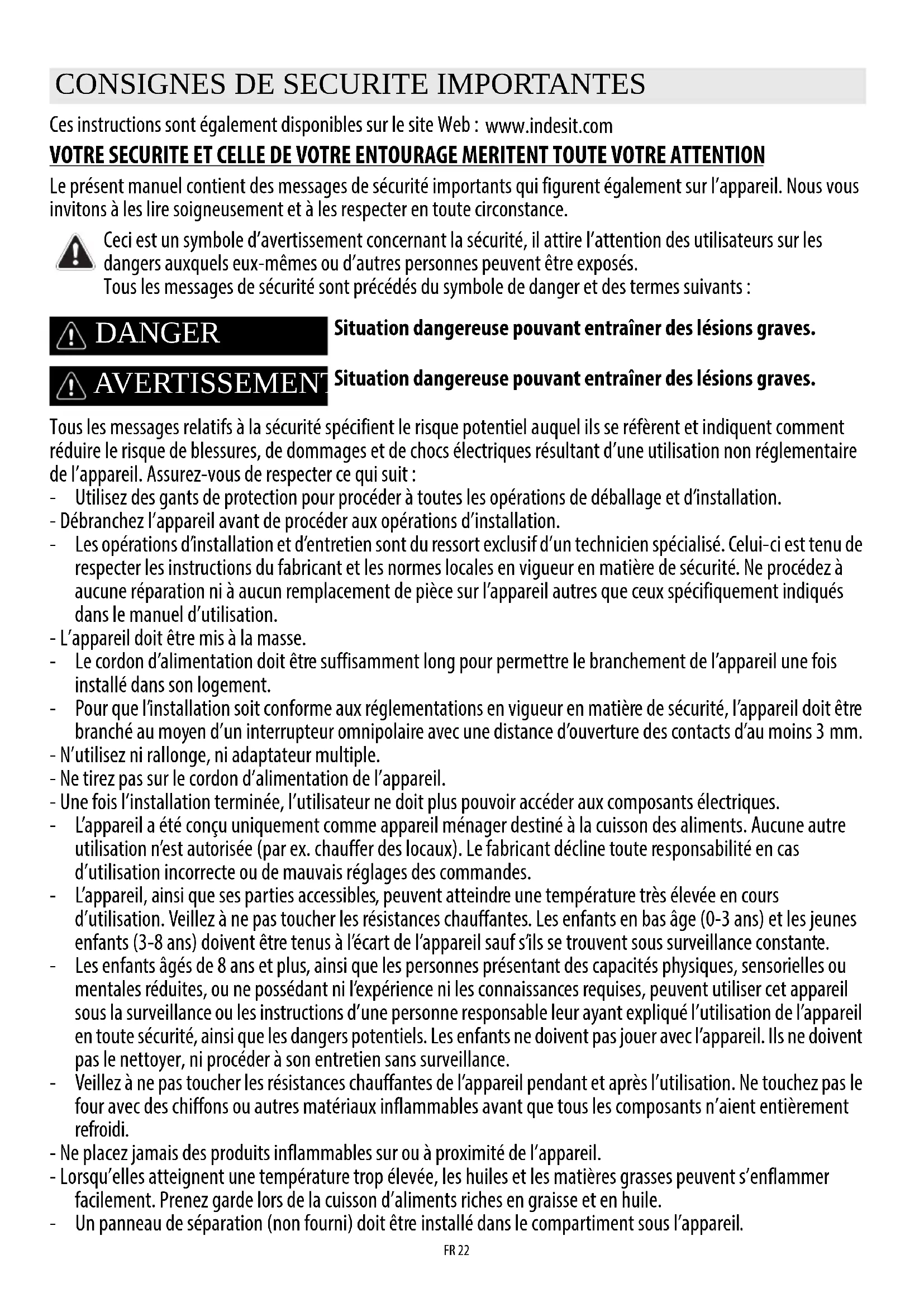 Ceci est un symbole d’avertissement concernant la sécurité, il attire l’attention des utilisateurs sur les dangers auxquels eux-mêmes ou d’autres personnes peuvent être exposés. Tous les messages de sécurité sont précédés du symbole de danger et des termes suivants : DANGER Situation dangereuse pouvant entraîner des lésions graves. AVERTISSEMENT Situation dangereuse pouvant entraîner des lésions graves. FRANÇAISInstallationPage2Mode d’emploi Page www.indesit.comFR 23 - Si la surface est fissurée, éteignez l’appareil pour éviter tout risque de choc électrique (uniquement pour les appareils avec surface en verre). - L’appareil n’est pas conçu pour être utilisé à l’aide d’une minuterie externe ou d’un dispositif de commande à distance séparé. - La cuisson sans surveillance d’un plat contenant de la graisse ou de l’huile sur une plaque chauffante peut s’avérer dangereuse et provoquer un incendie. N’essayez JAMAIS d’éteindre un feu avec de l’eau, mais éteignez l’appareil puis couvrez les flammes à l’aide d’un couvercle par ex. ou d’une couverture anti feu. Risque d’incendie : ne stockez pas d’objets sur les surfaces de cuisson. - N’utilisez pas d’appareils de nettoyage à la vapeur. - Les objets métalliques tels que les couteaux, fourchettes, cuillères et couvercles ne doivent pas être placés sur la surface de la table de cuisson car ils peuvent devenir très chauds. - Après l’utilisation, éteignez la table de cuisson à l’aide de sa commande et ne vous fiez pas au détecteur de casserole (uniquement pour les appareils à induction). Elimination des emballages Les matériaux d’emballage sont entièrement recyclables comme l’indique le symbole ( ). Ne les jetez pas dans la nature et respectez les réglementations locales en vigueur en matière d’élimination des déchets. Mise au rebut de l’appareil Cet appareil porte le symbole du recyclage conformément à la Directive Européenne 2012/19/CE relative aux déchets d’équipements électriques et électroniques (DEEE). En mettant correctement cet appareil au rebut, l’utilisateur contribue à prévenir les nuisances pour l’environnement et la santé. Le symbole sur l’appareil et sur la documentation qui l’accompagne indique qu’il ne peut en aucun cas être traité comme un déchet ménager et qu’il doit être remis à un centre de collecte agréé pour le recyclage des équipements électriques et électroniques. Conseils pour économiser l’énergie Pour obtenir les meilleurs résultats, nous vous conseillons en outre :