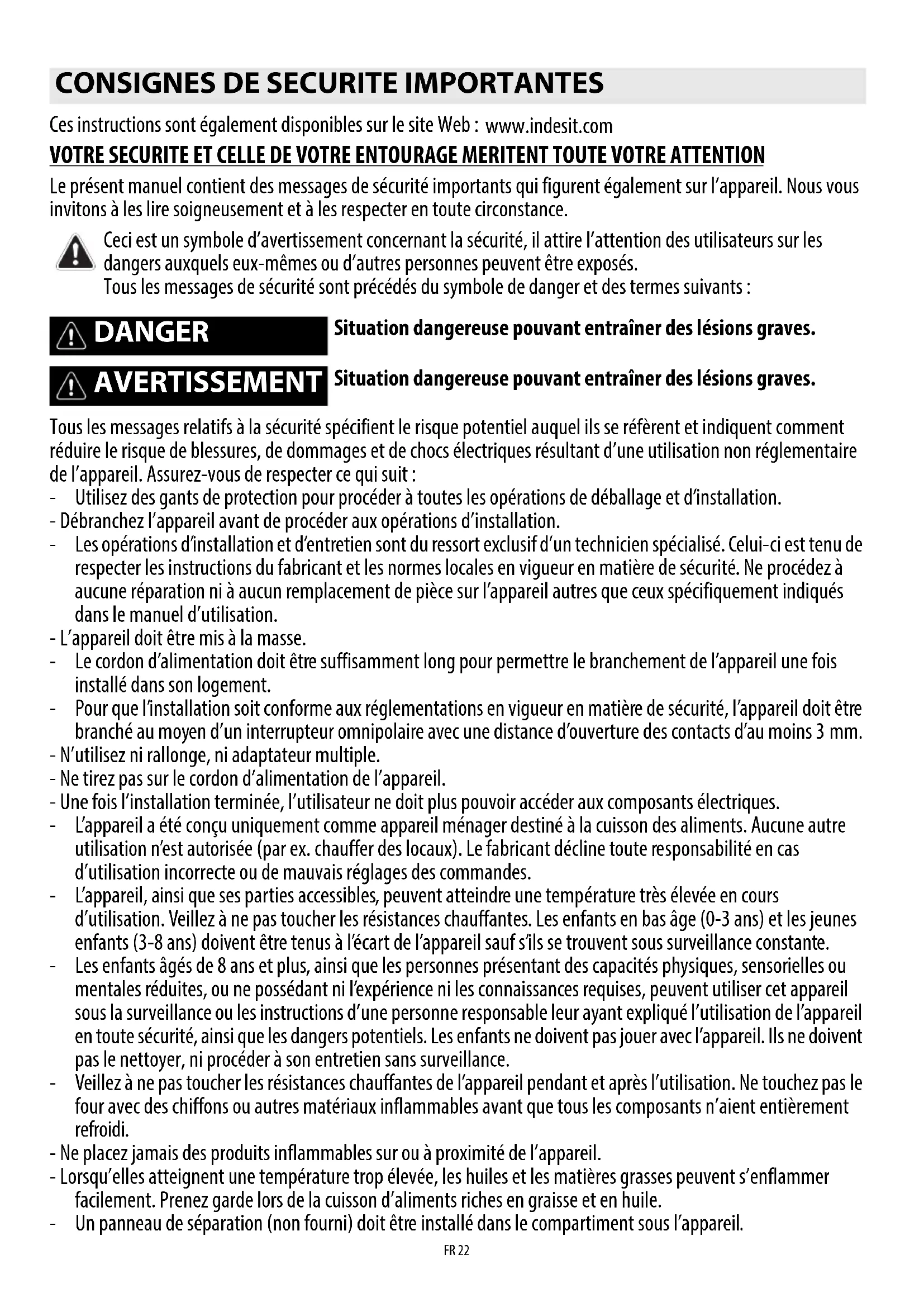 Ceci est un symbole d’avertissement concernant la sécurité, il attire l’attention des utilisateurs sur les dangers auxquels eux-mêmes ou d’autres personnes peuvent être exposés. Tous les messages de sécurité sont précédés du symbole de danger et des termes suivants : DANGER Situation dangereuse pouvant entraîner des lésions graves. AVERTISSEMENT Situation dangereuse pouvant entraîner des lésions graves. FRANÇAISInstallationPage2Mode d’emploi Page www.indesit.comFR 23 - Si la surface est fissurée, éteignez l’appareil pour éviter tout risque de choc électrique (uniquement pour les appareils avec surface en verre). - L’appareil n’est pas conçu pour être utilisé à l’aide d’une minuterie externe ou d’un dispositif de commande à distance séparé. - La cuisson sans surveillance d’un plat contenant de la graisse ou de l’huile sur une plaque chauffante peut s’avérer dangereuse et provoquer un incendie. N’essayez JAMAIS d’éteindre un feu avec de l’eau, mais éteignez l’appareil puis couvrez les flammes à l’aide d’un couvercle par ex. ou d’une couverture anti feu. Risque d’incendie : ne stockez pas d’objets sur les surfaces de cuisson. - N’utilisez pas d’appareils de nettoyage à la vapeur. - Les objets métalliques tels que les couteaux, fourchettes, cuillères et couvercles ne doivent pas être placés sur la surface de la table de cuisson car ils peuvent devenir très chauds. - Après l’utilisation, éteignez la table de cuisson à l’aide de sa commande et ne vous fiez pas au détecteur de casserole (uniquement pour les appareils à induction). Elimination des emballages Les matériaux d’emballage sont entièrement recyclables comme l’indique le symbole ( ). Ne les jetez pas dans la nature et respectez les réglementations locales en vigueur en matière d’élimination des déchets. Mise au rebut de l’appareil Cet appareil porte le symbole du recyclage conformément à la Directive Européenne 2012/19/CE relative aux déchets d’équipements électriques et électroniques (DEEE). En mettant correctement cet appareil au rebut, l’utilisateur contribue à prévenir les nuisances pour l’environnement et la santé. Le symbole sur l’appareil et sur la documentation qui l’accompagne indique qu’il ne peut en aucun cas être traité comme un déchet ménager et qu’il doit être remis à un centre de collecte agréé pour le recyclage des équipements électriques et électroniques. Conseils pour économiser l’énergie Pour obtenir les meilleurs résultats, nous vous conseillons en outre :