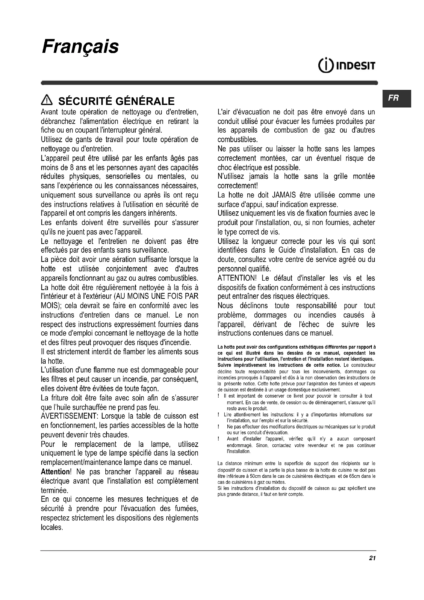 en fonctionnement, les parties accessibles de la hotte peuvent devenir très chaudes. Pour le remplacement de la lampe, utilisez uniquement le type de lampe spécifié dans la section remplacement/maintenance lampe dans ce manuel. Attention! Ne pas brancher l'appareil au réseau électrique avant que l'installation est complètement terminée. En ce qui concerne les mesures techniques et de sécurité à prendre pour l'évacuation des fumées, respectez strictement les dispositions des règlements locales. L'air d'évacuation ne doit pas être envoyé dans un conduit utilisé pour évacuer les fumées produites par les appareils de combustion de gaz ou d'autres combustibles. Ne pas utiliser ou laisser la hotte sans les lampes correctement montées, car un éventuel risque de choc électrique est possible. N’utilisez jamais la hotte sans la grille montée correctement! La hotte ne doit JAMAIS être utilisée comme une surface d'appui, sauf indication expresse. Utilisez uniquement les vis de fixation fournies avec le produit pour l'installation, ou, si non fournies, acheter le type correct de vis. Utilisez la longueur correcte pour les vis qui sont identifiées dans le Guide d'installation. En cas de doute, consultez votre centre de service agréé ou du personnel qualifié. ATTENTION! Le défaut d'installer les vis et les dispositifs de fixation conformément à ces instructions peut entraîner des risques électriques. Nous déclinons toute responsabilité pour tout problème, dommages ou incendies causés à l'appareil, dérivant de l'échec de suivre les instructions contenues dans ce manuel. La hotte peut avoir des configurations esthétiques différentes par rapport à ce qui est illustré dans les dessins de ce manuel, cependant les instructions pour l’utilisation, l’entretien et l’installation restent identiques. Suivre impérativement les instructions de cette notice. Le constructeur décline toute responsabilité pour tous les inconvénients, dommages ou incendies provoqués à l’appareil et dûs à la non observation des instructions de la présente notice. Cette hotte prévue pour l’aspiration des fumées et vapeurs de cuisson est destinée à un usage domestique exclusivement. ! Il est important de conserver ce livret pour pouvoir le consulter à tout moment. En cas de vente, de cession ou de déménagement, s’assurer qu’il reste avec le produit. ! Lire attentivement les instructions: il y a d’importantes informations sur l’installation, sur l’emploi et sur la sécurité. ! Ne pas effectuer des modifications électriques ou mécaniques sur le produit ou sur les conduit d’évacuation. ! Avant d'installer l'appareil, vérifiez qu’il n’y a aucun composant endommagé. Sinon, contactez votre revendeur et ne pas continuer l'installation. La distance minimum entre la superficie de support des récipients sur le dispositif de cuisson et la partie la plus basse de la hotte de cuisine ne doit pas être inférieure à 50cm dans le cas de cuisinières électriques et de 65cm dans le cas de cuisinières à gaz ou mixtes. Si les instructions d’installation du dispositif de cuisson au gaz spécifient une plus grande distance, il faut en tenir compte.22 BRANCHEMENT ÉLECTRIQUE La tension électrique doit correspondre à la tension reportée sur la plaque signalétique située à l’intérieur de la hotte. Si une prise est présente, branchez la hotte dans une prise murale conforme aux normes en vigueur et placée dans une zone accessible également après l’installation. Si aucune prise n’est présente (raccordement direct au circuit électrique), ou si la prise ne se trouve pas dans une zone accessible également après l’installation, appliquez un disjoncteur normalisé pour assurer de débrancher complètement la hotte du circuit électrique en conditions de catégorie surtension III, conformément aux règlementations de montage. Attention! Avant de rebrancher le circuit de la hotte à l’alimentation électrique et d’en vérifier le fonctionnement correct, contrôlez toujours que le câble d’alimentation soit monté correctement. Changement du câble d'alimentation La hotte est pourvue d'un câble d'alimentation spécial; en cas de détérioration du câble, en demander un neuf au service d'assistance technique.