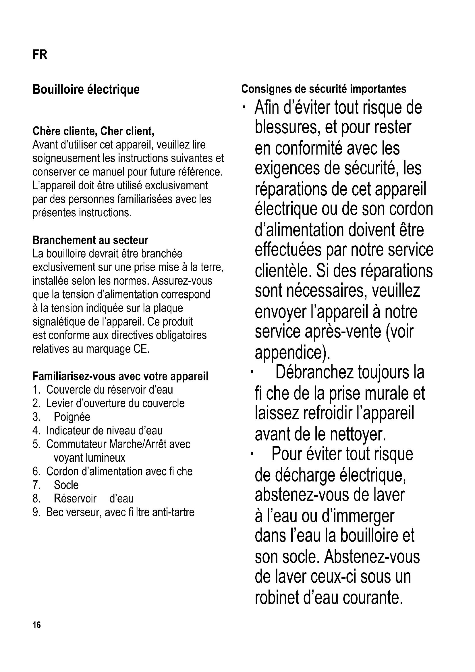 Consignes de sécurité importantes ∙ A fi n d’éviter tout risque de blessures, et pour rester en conformité avec les exigences de sécurité, les réparations de cet appareil électrique ou de son cordon d’alimentation doivent être effectuées par notre service clientèle. Si des réparations sont nécessaires, veuillez envoyer l’appareil à notre service après-vente (voir appendice). ∙ Débranchez toujours la fi che de la prise murale et laissez refroidir l’appareil avant de le nettoyer. ∙ Pour éviter tout risque de décharge électrique, abstenez-vous de laver à l’eau ou d’immerger dans l’eau la bouilloire et son socle. Abstenez-vous de laver ceux-ci sous un robinet d’eau courante. FR17 ∙ L’appareil doit être détartré régulièrement. Si nécessaire, nettoyez le réservoir d’eau avec un chiffon humide. ∙ Des informations détaillées concernant le nettoyage de l’appareil se trouvent dans le paragraphe Entretien et nettoyage. ∙ Cet appareil peut être utilisé par des enfants âgés d’au moins 8 ans, à condition qu’ils bénéfi cient d’une surveillance ou qu’ils aient reçu des instructions quant à l’utilisation de l’appareil en toute sécurité et qu’ils comprennent bien les dangers encourus. ∙ Le nettoyage et l’entretien par l’utilisateur ne doivent pas être effectués par des enfants, à moins qu’ils ne soient âgés de plus de 8 ans et qu’ils soient sous la surveillance d’un adulte. ∙ Conserver l’appareil et son câble hors de portée des enfants âgés de moins de 8 ans. ∙ Cet appareil peut être utilisé par des personnes dont les capacités physiques, sensorielles ou mentale sont réduites ou dont l’expérience ou les connaissances ne sont pas suffi santes, à condition qu’ils bénéfi cient d’une surveillance ou qu’ils aient reçu des instructions quant à l’utilisation de l’appareil en toute sécurité et en comprennent bien les dangers potentiels. ∙ Les enfants ne doivent pas utiliser l’appareil comme un jouet. ∙ Cet appareil est destiné à être utilisé dans des applications domestiques18 et analogues telles que : - des coins cuisines réservés au personnel dans des magasins, bureaux et autres environnements professionnels ; - des fermes ; - l’utilisation par les clients des hôtels, motels et autres environnements à caractère résidentiel ; - des environnements de type chambres d’hôtes. ∙ Les surfaces extérieures deviennent chaudes pendant l’utilisation et le restent quelque temps après. ∙ Ne laissez pas la bouilloire sans surveillance pendant qu’elle est en fonction. Utilisez uniquement de l’eau pure pour le remplissage du réservoir jusqu’au niveau désiré, en respectant les repères Min. (0,5 l) et Max. (1,7 l) de remplissage. Le remplissage excessif du réservoir pourrait s’avérer dangereux car il risque d’entraîner un échappement d’eau bouillante. ∙ Prenez garde également à la vapeur brûlante s’échappant de la bouilloire car elle risque de vous ébouillanter. Abstenez-vous par conséquent de toucher pendant l’emploi toute partie de l’appareil, sauf sa poignée. ∙ Attention ! Le couvercle doit toujours rester fermé pendant le processus d’ébullition et lorsque vous versez l’eau bouillante. ∙ La bouilloire sera utilisée exclusivement avec le socle fourni.19 ∙ N’enlevez jamais de son socle (ou remettez en place) le réservoir d’eau quand l’appareil est branché. ∙ Si le réservoir d’eau n’est pas sur son socle, mais laissé sur une surface lisse, assurez-vous qu’il ne peut pas glisser. ∙ Les connexions électriques dans le socle doivent être protégées en permanence contre tout contact éventuel avec l’eau. ∙ Attention : Une mauvaise utilisation peut provoquer des blessures corporelles graves. ∙ Attention : Tenez les enfants à l’écart des emballages, qui représentent un risque potentiel, par exemple, de suffocation. ∙ Avant toute utilisation, vérifi ez soigneusement que l’appareil, son cordon d’alimentation et ses accessoires ne présentent aucun signe de détérioration qui pourrait avoir un effet néfaste sur la sécurité de fonctionnement de l’appareil. Au cas où l’appareil, par exemple, serait tombé sur une surface dure, ou si une force excessive aurait été employée pour tirer sur le cordon d’alimentation, il ne doit plus être utilisé. ∙ L’appareil sera utilisé exclusivement sur une surface plane, résistante à la chaleur. ∙ Ne pas utiliser l’appareil sous un placard mural ou autre objet similaire, au risque de bloquer le bon échappement de la vapeur. ∙ Ne permettez jamais que le boîtier ou le cordon d’alimentation entre en contact avec aucune fl amme ou surface chaude telle qu’une plaque chauffante. ∙ Ne laissez pas pendre le cordon d’alimentation et tenez-le à l’abri des parties chaudes du boîtier. ∙ Portez le réservoir rempli d’eau chaude avec précaution. ∙ Débranchez toujours la fi che de la prise murale - en cas de fonctionnement défectueux, - après l’emploi, - avant de nettoyer l’appareil. Utilisation correcte ∙ Cet appareil est conçu uniquement pour faire chauffer de l’eau douce propre. Tout autre type d’utilisation est considéré comme impropre et peut entraîner des dommages corporels ou matériels. ∙ Il ne convient pas pour faire chauffer du lait, du thé ou autres aliments et boissons.20 Coupure thermique automatique Le dispositif de coupure thermique préréglé empêche la résistance de surchauffer au cas où l’appareil serait mis en service à vide, ou si la résistance est entartrée. Une fois que le dispositif de coupure automatique l’aura éteinte, la bouilloire, avant d’être rallumée, devra refroidir ou sera soumise à un détartrage. Avant la première utilisation Pour assurer une propreté totale, faites bouillir de l’eau et jetez celle-ci après le premier cycle d’ébullition. Ebullit