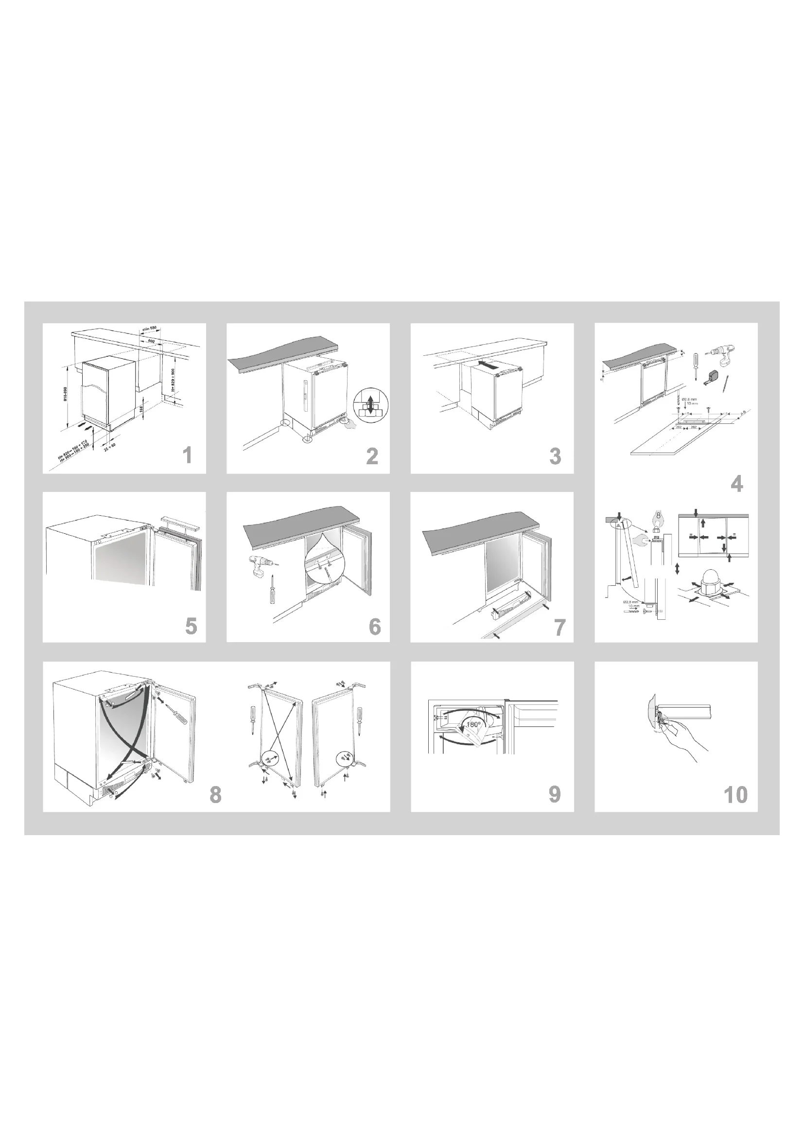 1 Dimensions de montage 2 Réglage de la hauteur 3 Encastrement de l'appareil sous le plan de travail 4 Fixation de la porte du meuble de cuisine 5 Pose du cache sur la plaque de fixation vissée sur la contreporte 6 Fixation de l'appareil sous le plan de travail 7 Ajuster la plinthe 8 Inversion du sens d’ouverture des portes (si nécessaire) 9 Changement du sens d'ouverture du portillon du compartiment basse température (sur certains modčles seulement) 10 Ouverture de la porte du compartiment surgélateur