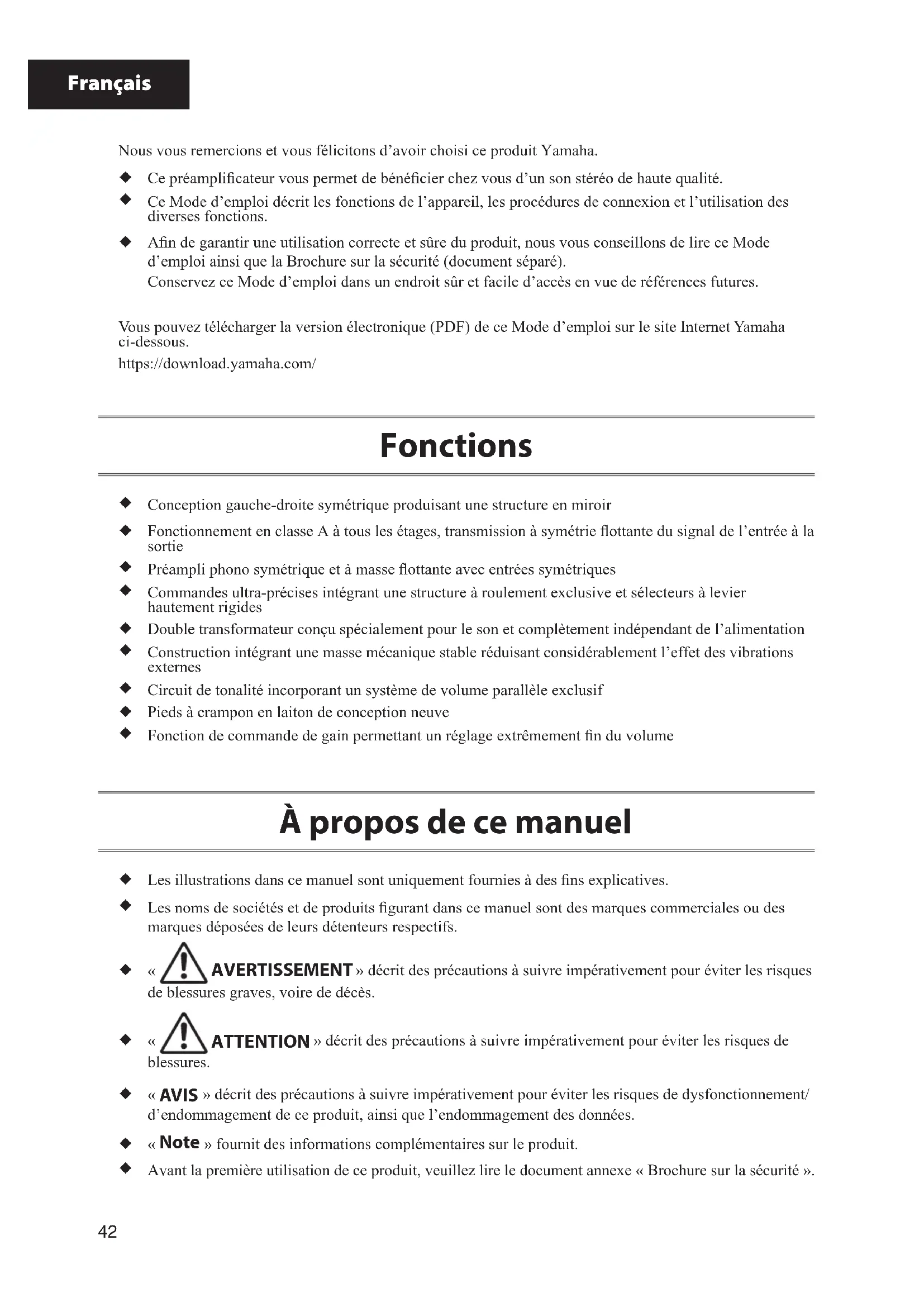 An de garantir une utilisation correcte et sûre du produit, nous vous conseillons de lire ce Mode d’emploi ainsi que la Brochure sur la sécurité (document séparé). Conservez ce Mode d’emploi dans un endroit sûr et facile d’accès en vue de références futures. Vous pouvez télécharger la version électronique (PDF) de ce Mode d’emploi sur le site Internet Yamaha ci-dessous. https://download.yamaha.com/ Fonctions