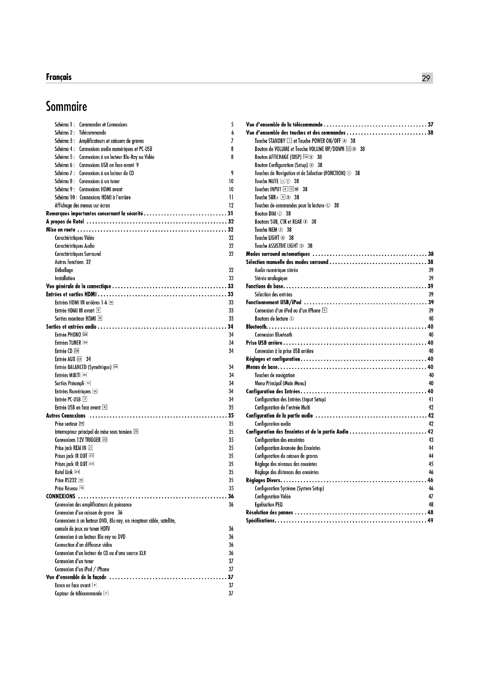 - Sorties 12V à déclenchements assignables (« triggers ») pour mise sous tension à distance d’autres composants, notamment des amplicateurs de puissance. Déballage Retirez soigneusement l’appareil de son emballage. Mettez de côté la télécommande et les autres accessoires. Conservez la boîte : elle vous permettra de protéger votre produit si vous avez à le déplacez ou nous le retourner pour une éventuelle opération de maintenance.33 Français Installation Installez l’appareil sur une surface rigide et plane, éloignée des rayons directs du soleil, de toute source de chaleur, d’humidité ou de vibrations. Tenez compte du poids et des dimensions de l’appareil. Si vous posez l’appareil sur une étagère, un meuble ou dans un rack, vériez que ceux-ci sont parfaitement en mesure de supporter son poids. Placez l’appareil près des autres éléments du système si possible, et sur sa propre étagère. Utilisez le cas échéant les joues latérales de xation pour rack. Cela facilitera les premières connexions et rendra plus simple tout changement au sein du système.L’appareil génère de la chaleur pendant son fonctionnement normal. Ne bloquez donc pas ses ouïes de refroidissement. Il doit y avoir environ 10 cm de dégagement tout autour de l’appareil pour permettre un bon fonctionnement de sa ventilation, et une bonne circulation d’air autour du meuble qui le supporte. Ne posez pas sur l’appareil d’autres maillons ou objets. Ne laissez aucun liquide pénétrer à l’intérieur de son châssis. Vue générale de la connectique REMARQUE : Ne connectez pas un élément du système au secteur tant que toutes les connexions n’ont pas été effectuées correctement. Chacun des éléments source doit être relié aux entrées correspondantes de l’appareil par une paire de câbles RCA standard ou de câbles symétriques XLR pour l’audio analogique, une connexion vidéo HDMI, et en option un câble audio numérique (coaxial ou optique). Les signaux audio issus du processeur RSP-1576 sont délivrés aux amplicateurs de puissance par l’intermédiaire de câbles RCA standards et depuis les sorties préampli audio. Le signal vidéo du RSP-1576 est envoyé à l’aide de connexions HDMI. En outre, le processeur dispose d’entrées MULTI pour une utilisation avec un élément source réalisant son propre décodage surround interne, d’entrées pour capteurs IR pour le contrôle à distance, et de connexions à déclenchements 12V (triggers). REMARQUE : L’interface S/PDIF audio numérique requiert une impédance de 75 ohms et tous les câbles numériques de qualité sont conformes à cette spécification. N’utilisez PAS de câbles audio standards pour réaliser les connexions audio ou vidéo numériques. Les câbles audio standards pourront certes transmettre ces signaux, mais leur bande passante limitée réduira les performances. Lorsque vous effectuez les connexions, veuillez à bien relier les canaux gauches sur les entrées pour canaux gauches marquées LEFT, et les canaux droits sur les entrées pour canaux droits marqués RIGHT. Pour toutes les connexions de type RCA de cet appareil, veuillez-vous conformer aux codes de couleurs standards: Canal audio gauche : prise RCA blanche Canal audio droit : prise RCA rouge REMARQUE : Chaque entrée source doit être correctement configurée par le menu INPUT SETUP à partir du système de menus OSD. Nous vous recommandons d’utiliser ce menu après avoir connecté chaque nouvelle source pour pouvoir la configurer comme vous le souhaitez. Reportez-vous au paragraphe Gestion des Entrées dans la section Configuration pour plus d’informations. Entrées et sorties HDMI Ces prises sont utilisées pour pouvoir connecter les signaux vidéo qui entrent et qui sortent de l’appareil. Reportez-vous à la section Connexions en page 16 pour des instructions spéciques à chaque type d’élément source. Entrées HDMI IN arrières 1-6 r Les entrées HDMI offrent des connexions vidéo numériques pour une utilisation avec des appareils disposant de sorties HDMI. Les connexions HDMI peuvent transporter des signaux vidéo dans toutes les résolutions, y compris en 3D, 1080p/24Hz, et 4K. L’implémentation de la connexion HDMI permet aussi la prise en charge des signaux audio, ou la mise en œuvre d’une connexion audio distincte à partir d’un appareil HDMI. Toutes les entrées HDMI compatibles 4K UHD HDCP 2.2 sont libellées telles quelles sur le panneau arrière. Entrée HDMI IN avant 6 L’entrée vidéo 7 est disposée sur le panneau avant pour un accès plus facile. Utilisez cette connexion HDMI avec les sources portables qui ne nécessitent pas d’être connectées en permanence. Sorties moniteur HDMI e Les deux sorties HDMI de l’appareil restituent les signaux vidéo Haute Dénition à deux moniteur TV. Ces sorties HDMI permettent de faire transiter tous les formats haute dénition 2D (480p/576p, 720p, 1080i, 1080p ou 4K) et 3D (jusqu’à 1080p/24 Hz). Les deux sorties HDMI sont compatibles 4K UHD HDCP 2.2, comme libellé sur le panneau arrière.Il y a deux sorties HDMI sur le panneau arrière qui délivrent le même signal vidéo. Une seule de ces deux prises pourra envoyer le menu OSD ( afchage sur écran) à votre TV.Sur ces deux sorties HDMI, une seule est compatible ARC (Audio Return Channel). Elle est spéciquement libellée « ARC/OSD » au-dessus du connecteur HDMI. Reportez-vous à la page 41 au paragraphe INPUT SETUP de ce manuel pour plus de détails.Votre téléviseur peut le cas échéant disposer de plusieurs entrées HDMI. Toutes les entrées HDMI ne sont pas compatibles ARC (Retour du Signal Audio). Utilisez l’entrée HDMI compatible ARC de votre TV pour disposer des fonctions ARC de votre appareil Rotel. Les entrées compatibles ARC sont généralement libellées « ARC » auprès du connecteur HDMI correspondant. Informations complémentaires concernant les sorties vidéo HDMI :•