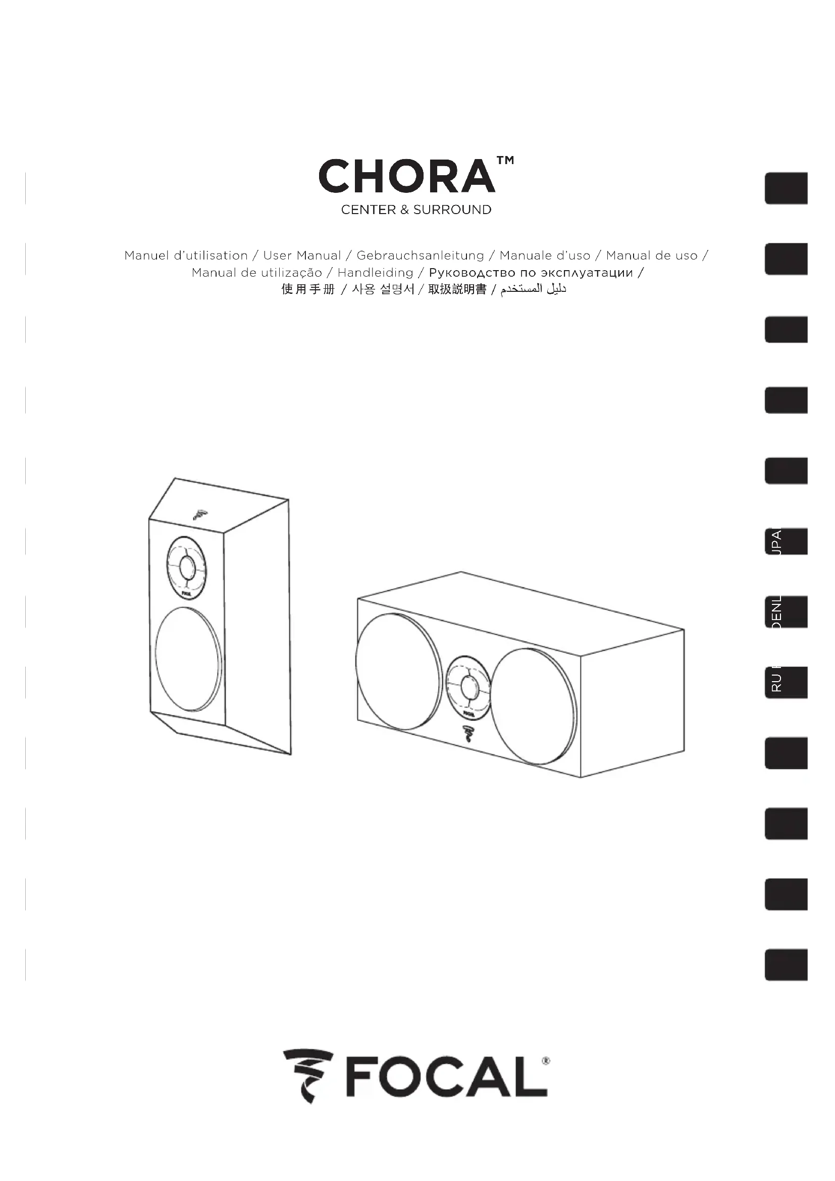 Dans un but d'évolution, Focal-JMlab se réserve le droit de modifier les spécifications techniques de ses produits sans préavis. Images non contractuelles. Pour validation de la garantie Focal-JMlab, il est maintenant possible d’enregistrer son produit en ligne : www.focal.com/garantie Manuel d’utilisation Vous venez d’acquérir un produit Focal et nous vous en remercions. Bienvenue dans notre univers, celui de la Haute-Fidélité. Innovation, tradition, excellence et plaisir sont nos valeurs ; notre seul objectif est de vous offrir un son pur, fidèle et riche. Afin d’exploiter toutes les performances de votre produit, nous vous conseillons de lire les instructions de ce livret puis de le conserver soigneusement pour vous y référer ultérieurement. Manutention (fig.A) Les enceintes Chora présentent des angles vifs. Prenez garde à ne pas vous blesser lorsque vous les manipulez. Porte-tissus (fig.B) Les enceintes Chora sont livrées avec des porte-tissus permettant de protéger les haut-parleurs. Vous pouvez les mettre ou les enlever facilement grâce à leur système d’accroche magnétique. Nous vous conseillons de les retirer lorsque vous écoutez de la musique afin de profiter des meilleures performances de vos enceintes. Branchements (fig.C) Les connecteurs des Chora assurent des contacts fiables et polyvalents, pour câbles dénudés (jusqu’à 4 mm de diamètre), fourches ou fiche banane. Il est impératif de respecter la polarité des enceintes. Le connecteur marqué «+» doit être connecté sur la sortie correspondante de l’amplificateur, le connecteur marqué «-» sur la borne négative. Si cette condition n’est pas respectée, l’image stéréo et la perception du grave se dégraderont considérablement. Choisissez des câbles de qualité de section appropriés à la longueur : votre revendeur saura vous conseiller. Conseils d’utilisation Le comportement des enceintes dépend de l’acoustique de la pièce, du bon positionnement des enceintes dans celui-ci et de l’emplacement de l’auditeur. Il est possible d’interagir sur ces éléments pour corriger ou améliorer un effet recherché. Le son est dur, agressif : l’acoustique de votre pièce est probablement trop réverbérante. Envisagez l’utilisation de matériaux absorbants (tapis, canapé, tentures murales, rideaux…) et réfléchissants (mobilier) pour absorber ou diffuser les résonances. Le son est "plat", étouffé : excès de matériaux absorbants dans la pièce, le son est bouché, sans relief. Recherchez un meilleur compromis entre les matériaux absorbants et réfléchissants de votre intérieur.10 CHORA