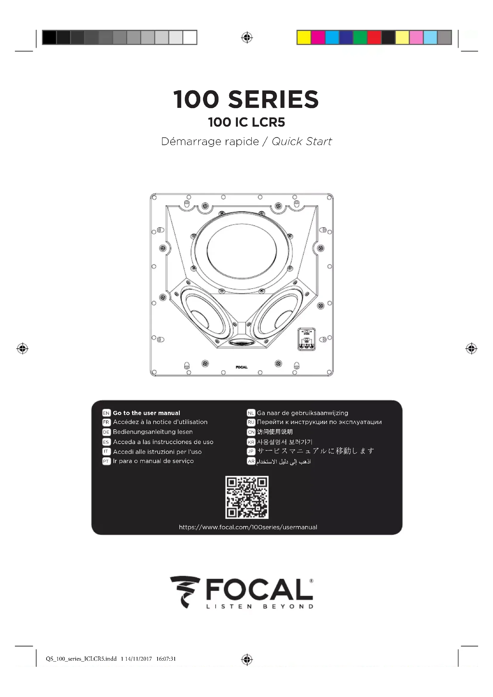 Ajustez l’orientation du tweeter en direction de la zone d’écoute. Adjust the tweeter orientation toward the listening area. Sécurisez l’installation en vissant ensemble le produit et l’ossature du plafond à l’aide des vis fournies. Secure the installation by screwing the product and the framing material together with provided screws Utilisez les commutateurs sur la façade de l’enceinte afin de choisir le mode de fonctionnement de l’enceinte (MODE) et de régler le niveau sonore du tweeter (HF LEVEL). Use the switches in front of the loudspeaker to choose your operating mode (MODE) and to set the tweeter level (HF LEVEL) Installez la grille livrée avec le produit devant l’enceinte. Install the grille provided with the product in front of the loudspeaker. QS_100_series_ICLCR5.indd 3 14/11/2017 16:07:32Pour validation de la garantie Focal-JMlab, il est maintenant possible d’enregistrer son produit en ligne : www.focal.com/garantie Please validate your Focal-JMlab warranty, it is now possible to register your product online: www.focal.com/warranty Focal-JMlab