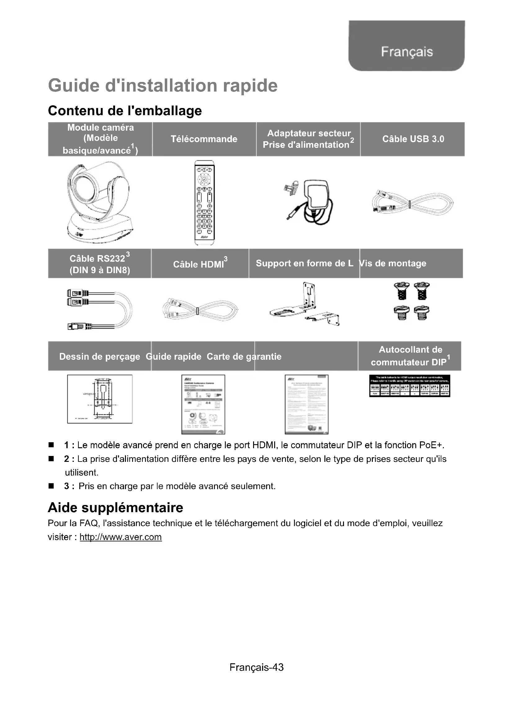1 : Le modèle avancé prend en charge le port HDMI, le commutateur DIP et la fonction PoE+. 2 : La prise d'alimentation diffère entre les pays de vente, selon le type de prises secteur qu'ils utilisent. 3 : Pris en charge par le modèle avancé seulement. Aide supplémentaire Pour la FAQ, l'assistance technique et le téléchargement du logiciel et du mode d'emploi, veuillez visiter : http://www.aver.com Français-44 Aperçu général