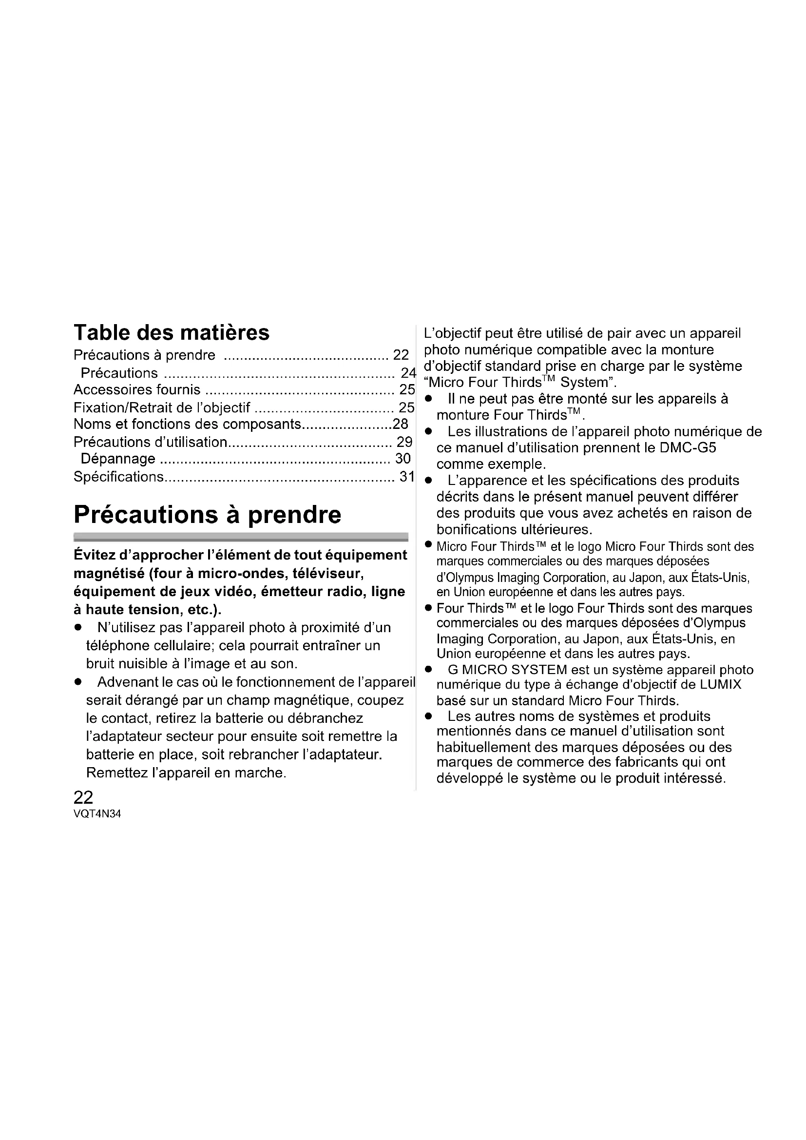 - Spécifications Précautions à prendre Évitez d’approcher l’élément de tout équipement magnétisé (four à micro-ondes, téléviseur, équipement de jeux vidéo, émetteur radio, ligne à haute tension, etc.). ≥ N’utilisez pas l’appareil photo à proximité d’un téléphone cellulaire; cela pourrait entraîner un bruit nuisible à l’image et au son. ≥ Advenant le cas où le fonctionnement de l’appareil serait dérangé par un champ magnétique, coupez le contact, retirez la batterie ou débranchez l’adaptateur secteur pour ensuite soit remettre la batterie en place, soit rebrancher l’adaptateur. Remettez l’appareil en marche. L’objectif peut être utilisé de pair avec un appareil photo numérique compatible avec la monture d’objectif standard prise en charge par le système “Micro Four Thirds p. 31