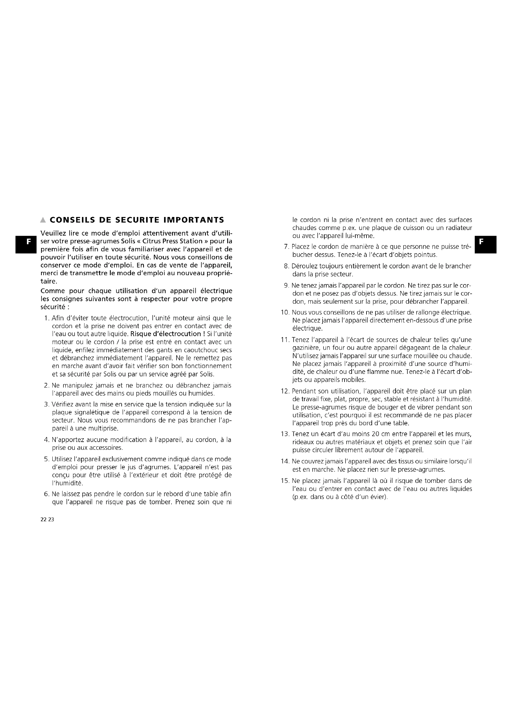 Veuillez lire ce mode d’emploi attentivement avant d’utili- ser votre presse-agrumes Solis « Citrus Press Station » pour la première fois afin de vous familiariser avec l’appareil et de pouvoir l’utiliser en toute sécurité. Nous vous conseillons de conserver ce mode d’emploi. En cas de vente de l’appareil, merci de transmettre le mode d’emploi au nouveau proprié- taire. Comme pour chaque utilisation d’un appareil électrique les consignes suivantes sont à respecter pour votre propre sécurité :