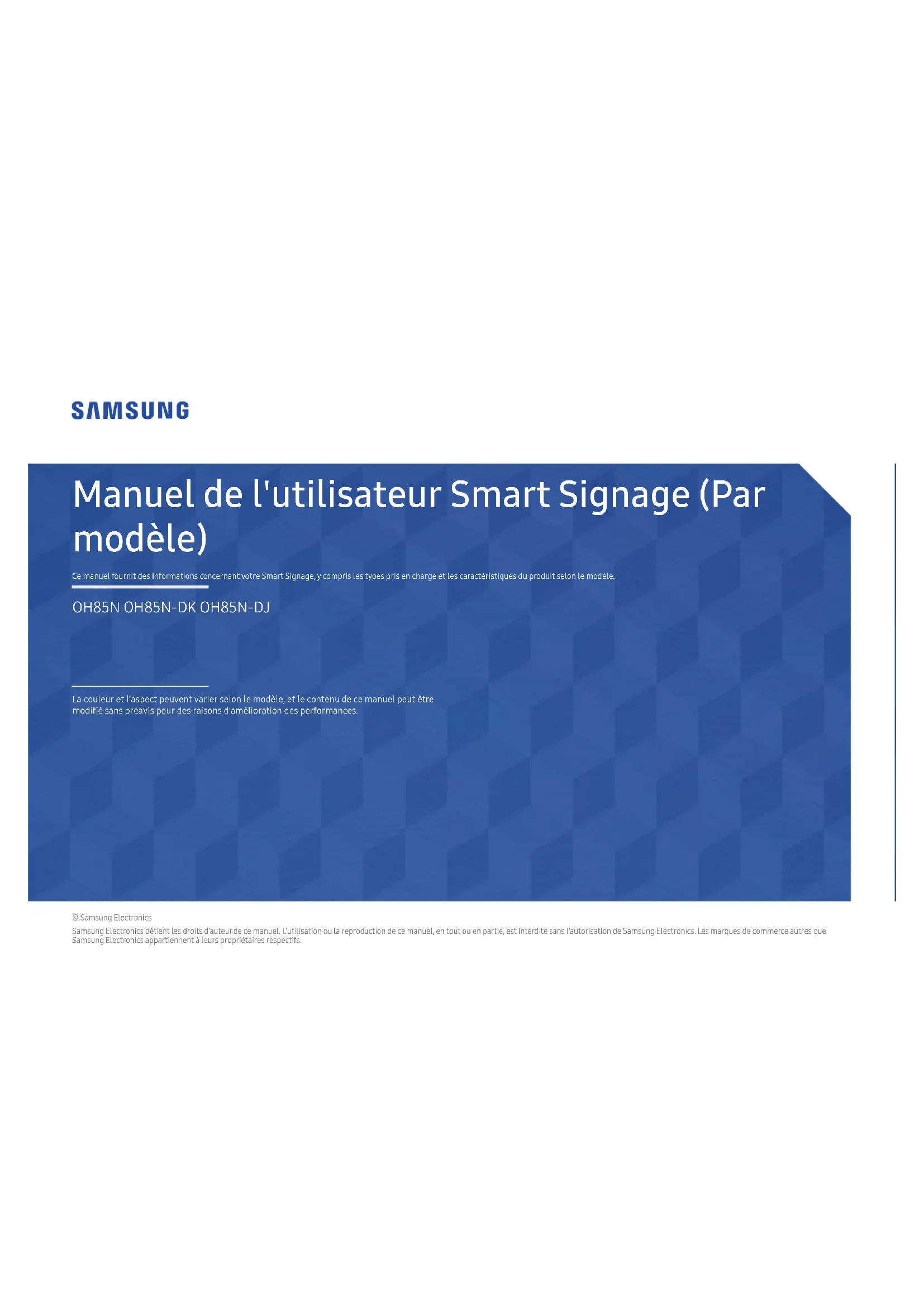 Manuel de l'utilisateur Smart Signage (Par modèle) Ce manuel fournit des informations concernant votre Smart Signage, y compris les types pris en charge et les caractéristiques du produit selon le modèle. © Samsung Electronics Samsung Electronics détient les droits d'auteur de ce manuel. L'utilisation ou la reproduction de ce manuel, en tout ou en partie, est interdite sans l'autorisation de Samsung Electronics. Les marques de commerce autres que Samsung Electronics appartiennent à leurs propriétaires respectifs. OH85N OH85N-DK OH85N-DJ La couleur et l'aspect peuvent varier selon le modèle, et le contenu de ce manuel peut être modié sans préavis pour des raisons d'amélioration des performances.Table des matières Préparation Vérification des composants 3 Pièces 4 Connecteurs 5 OH85N 5 OH85N-DK/OH85N-DJ 6 Avant d'installer l'appareil (guide d'installation) 7 Rotation 7 Ventilation 7 Avant la connexion des câbles 8 Guide de connexion du câble d'alimentation 11 Spécifications du support mural 16