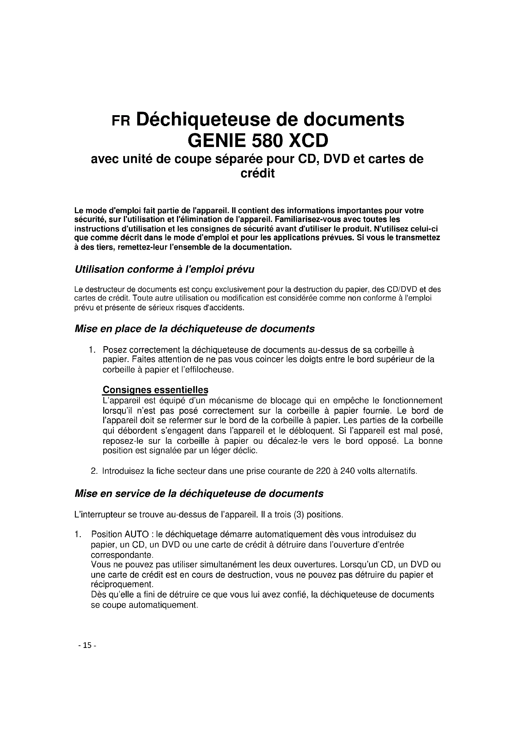 The CE Mark on the device confirms conformity. The Declaration of Conformity can be read online at www.go-europe.com- 15 - FR Déchiqueteuse de documents GENIE 580 XCD avec unité de coupe séparée pour CD, DVD et cartes de crédit