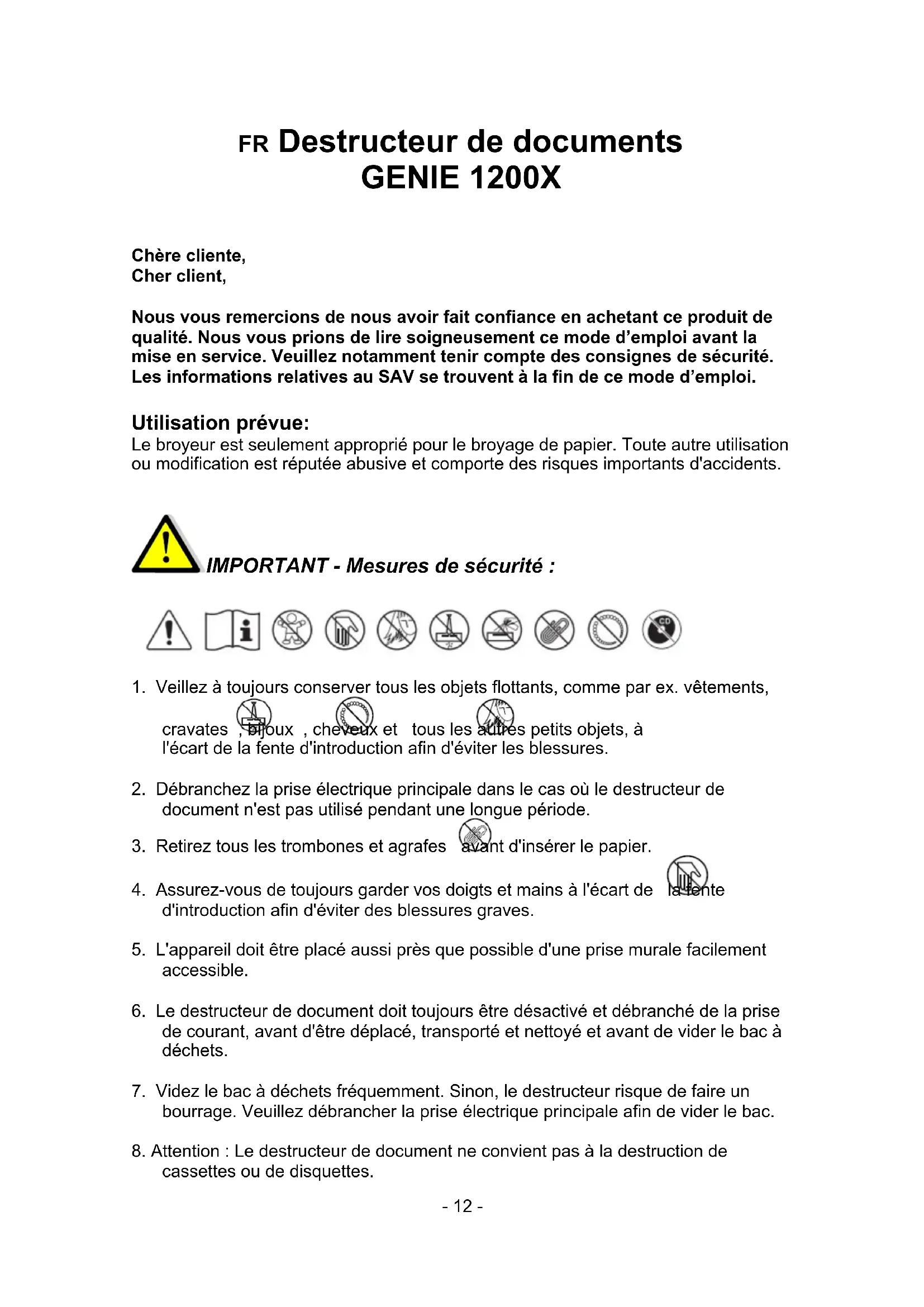 1200X - Destructeur de document Genie - Notice d'utilisation et mode d'emploi gratuit