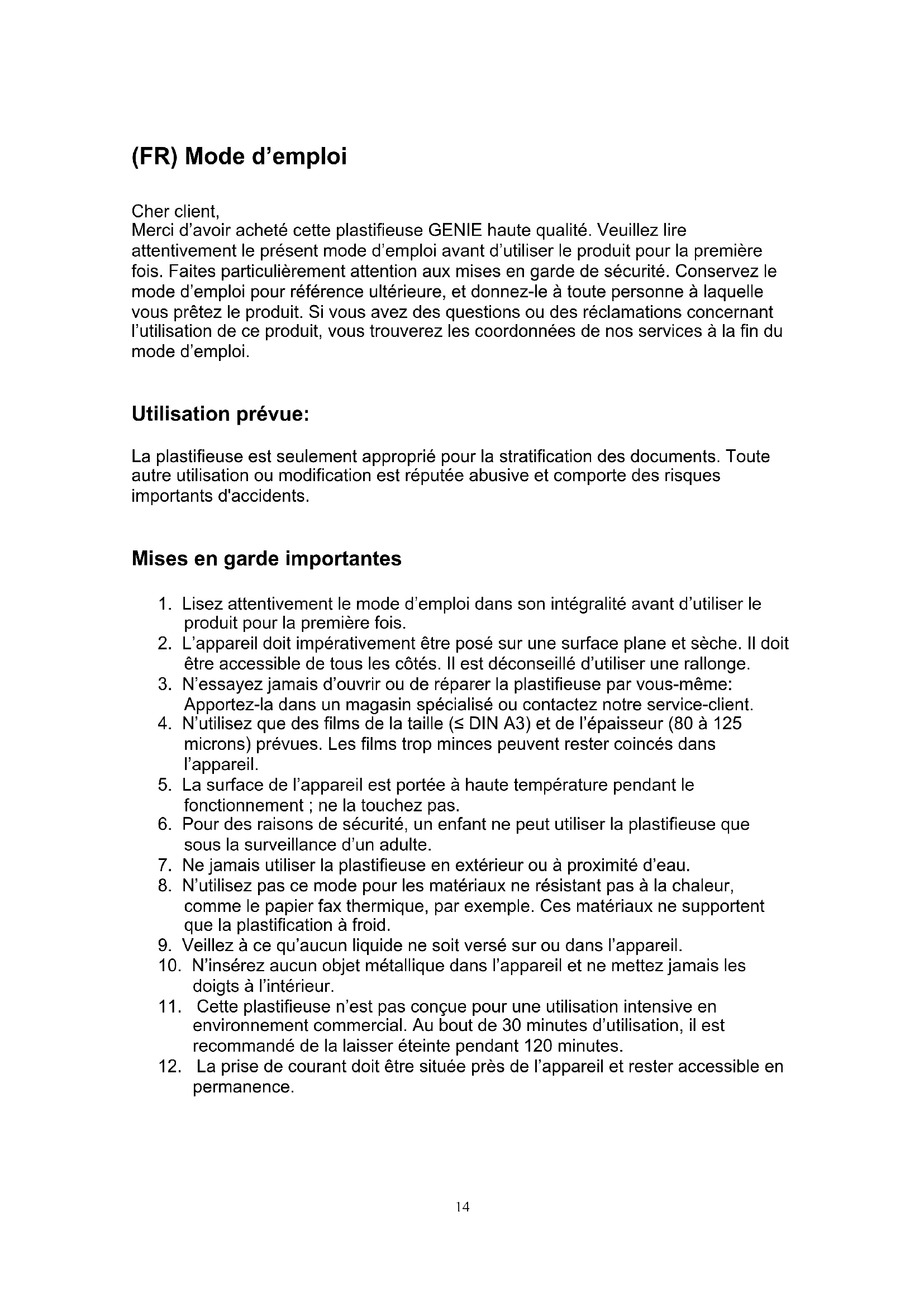 Importatore: GENIE GmbH & Co. KG Berta-Cramer-Ring 22 65205 Wiesbaden, Germany14 (FR) Mode d’emploi Cher client, Merci d’avoir acheté cette plastifieuse GENIE haute qualité. Veuillez lire attentivement le présent mode d’emploi avant d’utiliser le produit pour la première fois. Faites particulièrement attention aux mises en garde de sécurité. Conservez le mode d’emploi pour référence ultérieure, et donnez-le à toute personne à laquelle vous prêtez le produit. Si vous avez des questions ou des réclamations concernant l’utilisation de ce produit, vous trouverez les coordonnées de nos services à la fin du mode d’emploi.