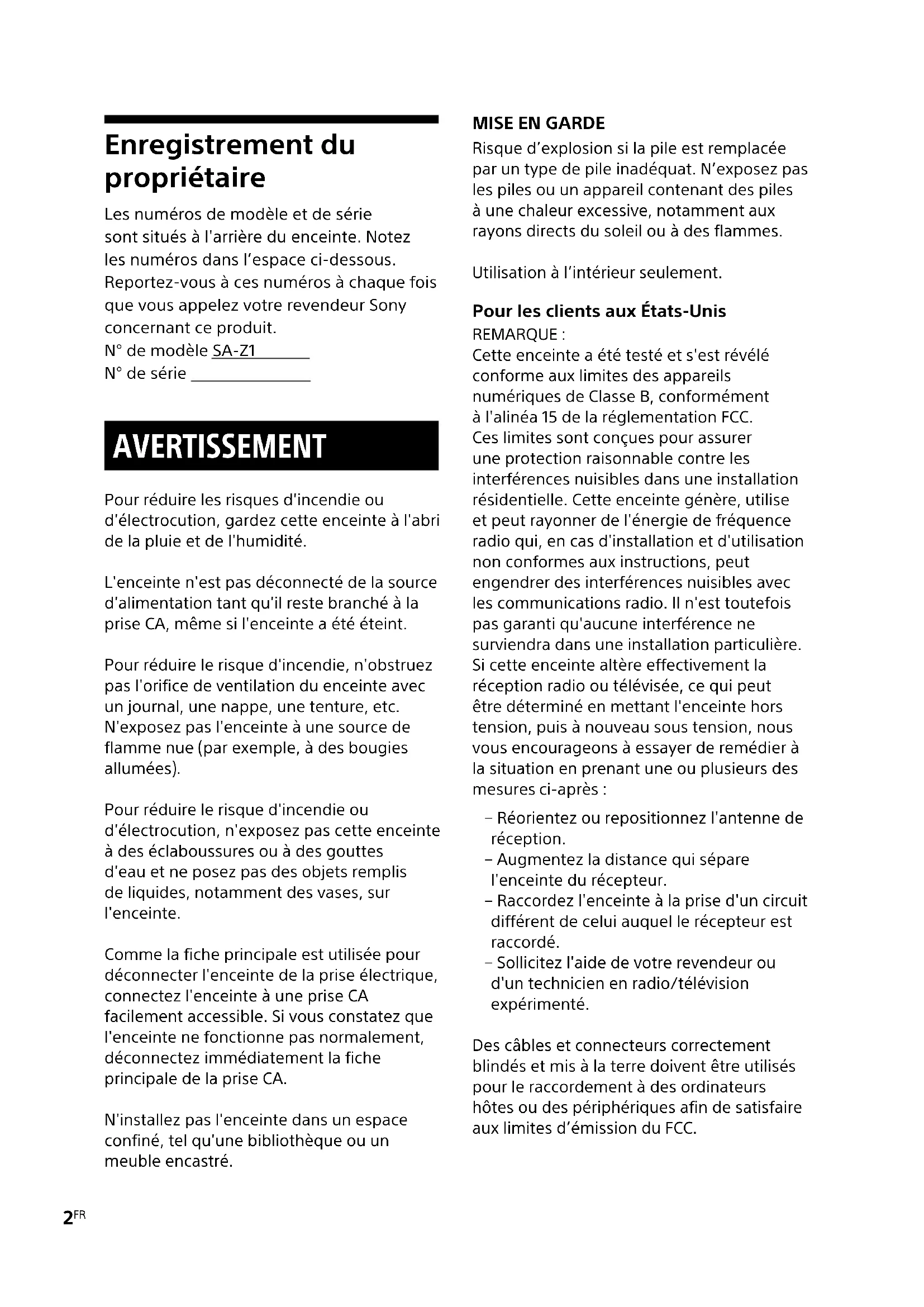 Enregistrement du propriétaire Les numéros de modèle et de série sont situés à l'arrière du enceinte. Notez les numéros dans l’espace ci-dessous. Reportez-vous à ces numéros à chaque fois que vous appelez votre revendeur Sony concernant ce produit. N° de modèle SA-Z1 N° de série AVERTISSEMENT Pour réduire les risques d'incendie ou d'électrocution, gardez cette enceinte à l'abri de la pluie et de l'humidité.L'enceinte n'est pas déconnecté de la source d'alimentation tant qu'il reste branché à la prise CA, même si l'enceinte a été éteint.Pour réduire le risque d'incendie, n'obstruez pas l'orifice de ventilation du enceinte avec un journal, une nappe, une tenture, etc. N'exposez pas l'enceinte à une source de flamme nue (par exemple, à des bougies allumées).Pour réduire le risque d'incendie ou d'électrocution, n'exposez pas cette enceinte à des éclaboussures ou à des gouttes d'eau et ne posez pas des objets remplis de liquides, notamment des vases, sur l'enceinte.Comme la fiche principale est utilisée pour déconnecter l'enceinte de la prise électrique, connectez l'enceinte à une prise CA facilement accessible. Si vous constatez que l'enceinte ne fonctionne pas normalement, déconnectez immédiatement la fiche principale de la prise CA.N'installez pas l'enceinte dans un espace confiné, tel qu'une bibliothèque ou un meuble encastré.